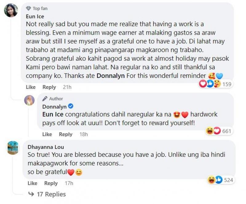 “Sobrang grateful ako kahit pagod sa work at almost holiday may pasok kami pero bawi naman lahat. Na-regular na ko and still thankful sa company ko. Thanks ate Donnalyn For this wonderful reminder.”