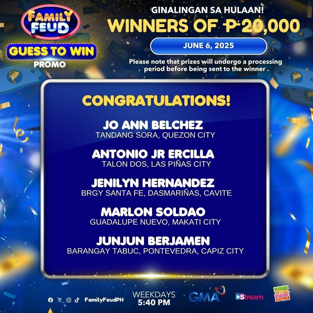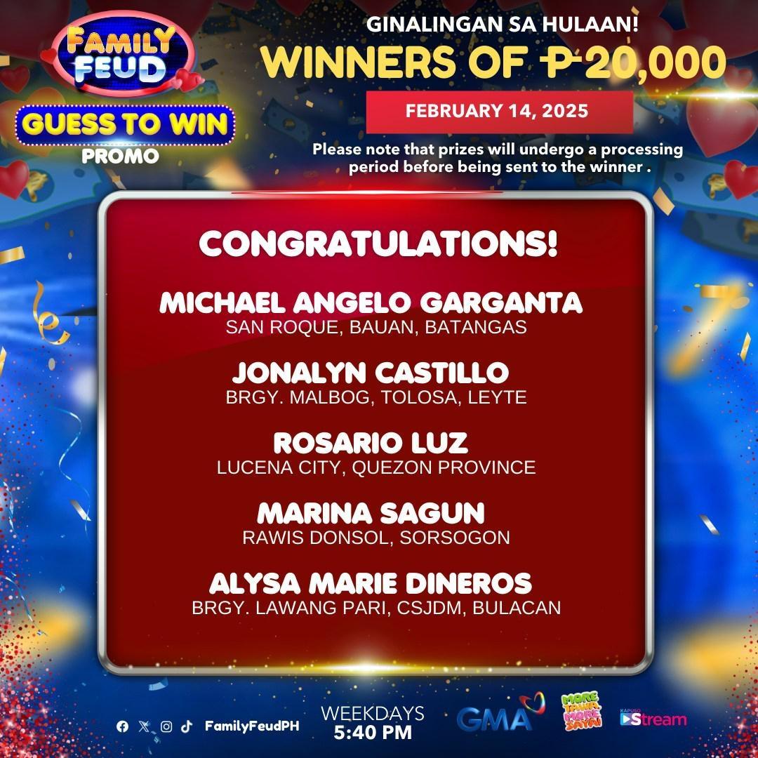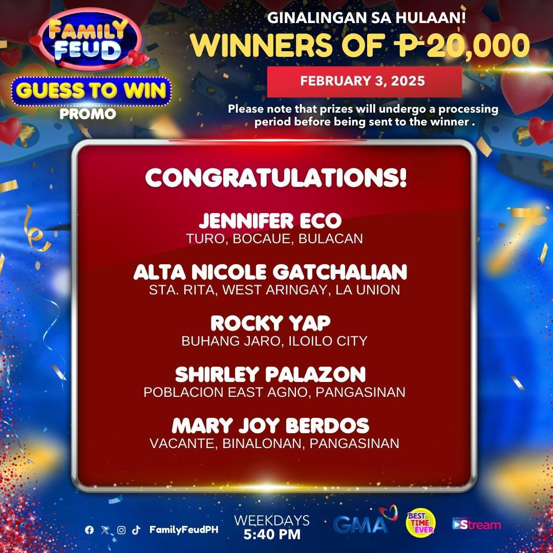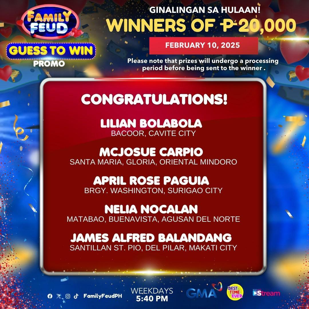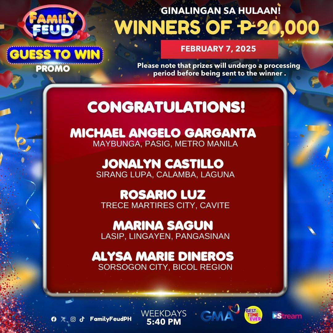 Narito ang mga listahan ng mga nagwagi sa Family Feud "Guess To Win" Promo.
