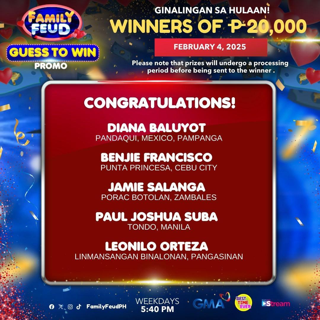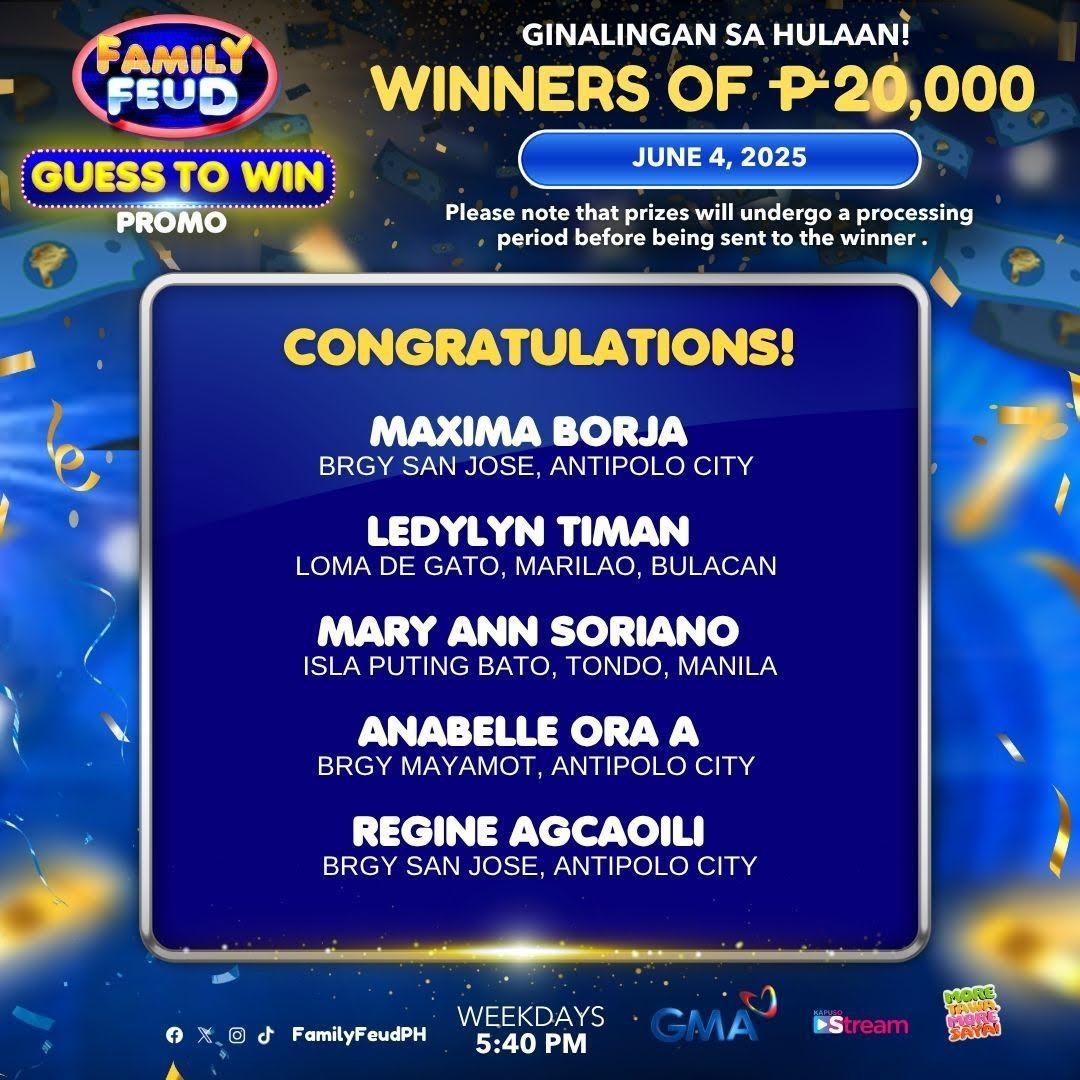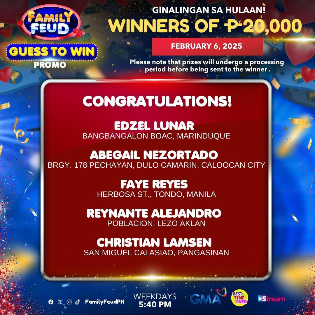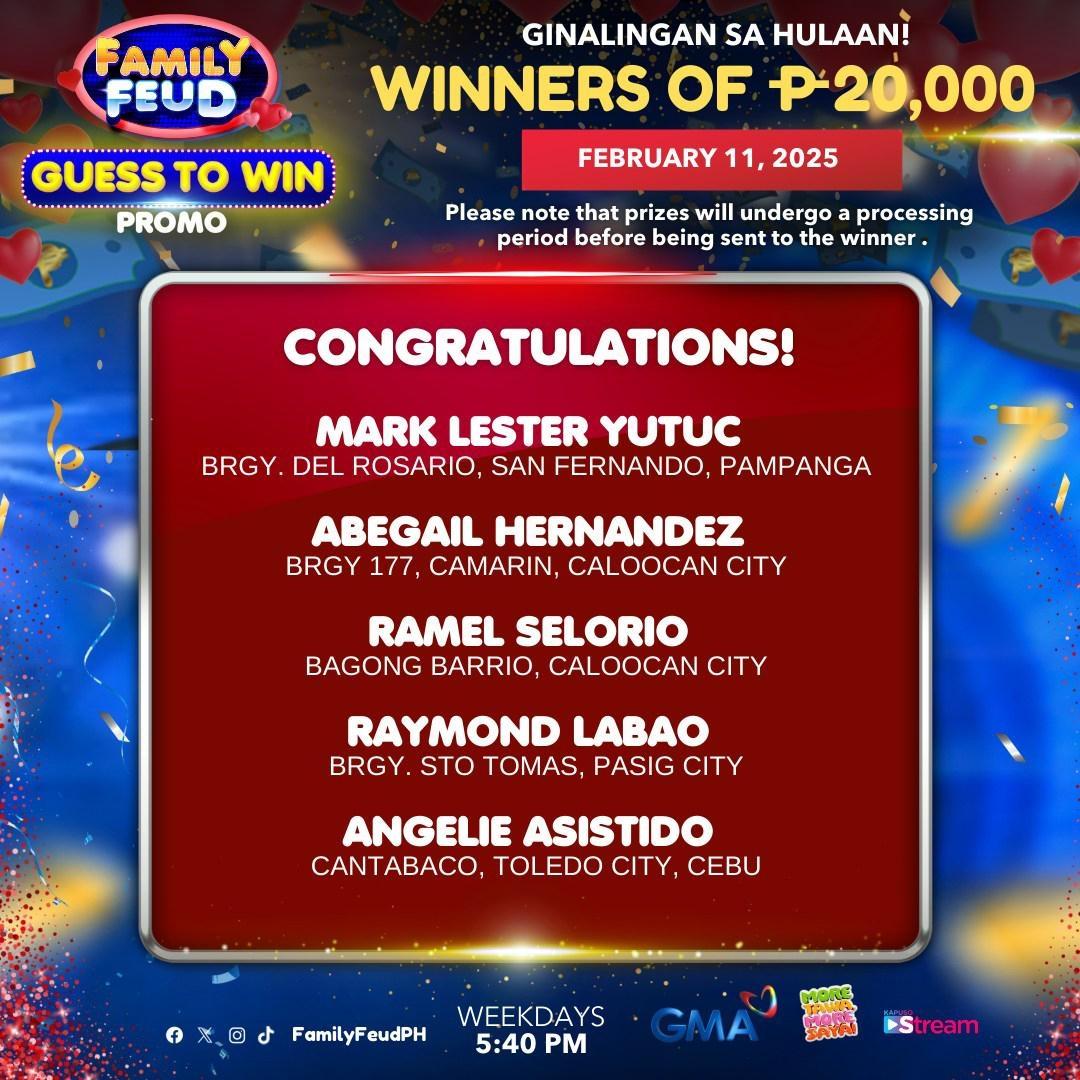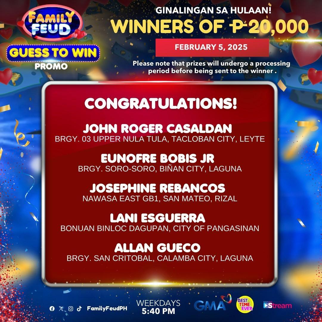Narito ang mga listahan ng mga nagwagi sa Family Feud "Guess To Win" Promo.