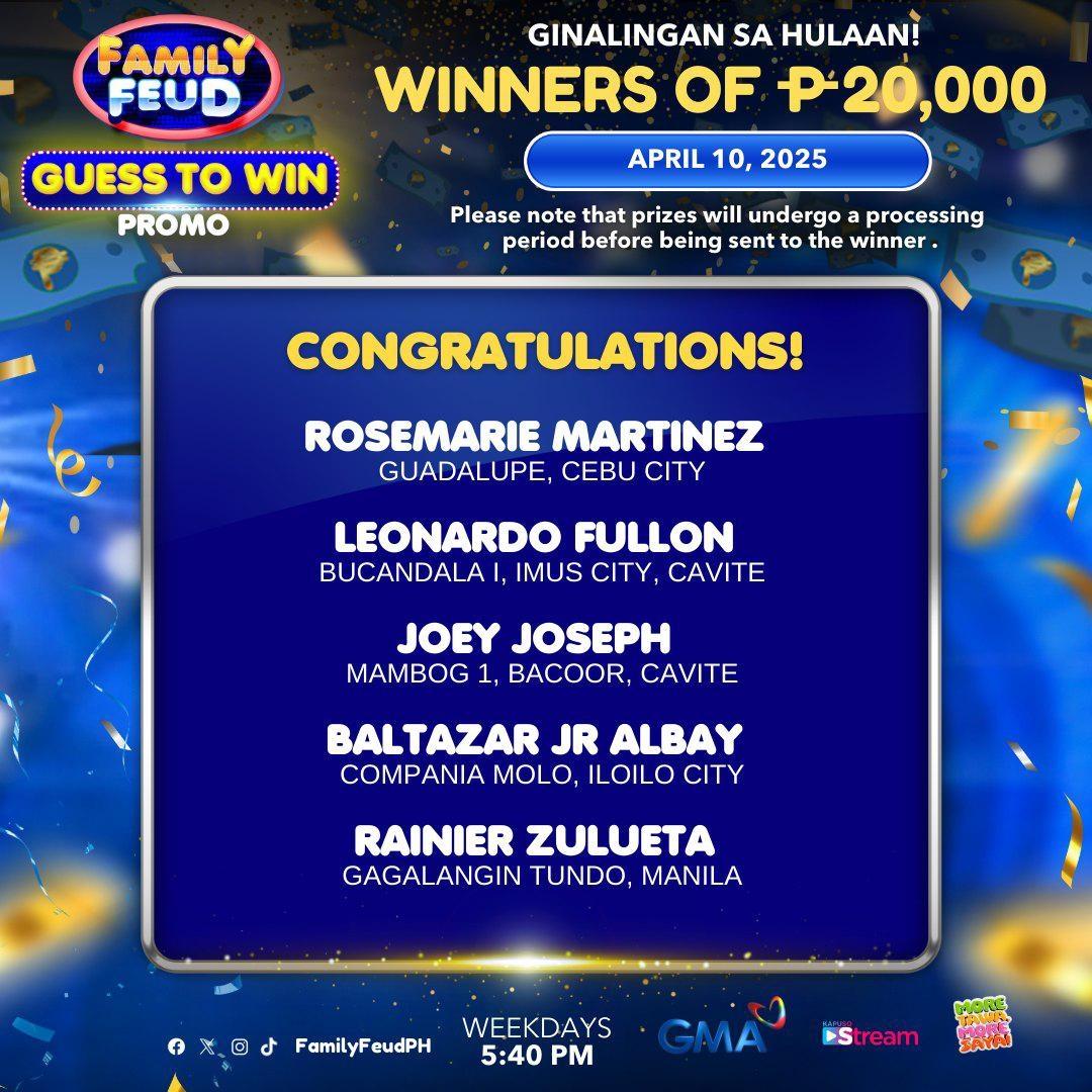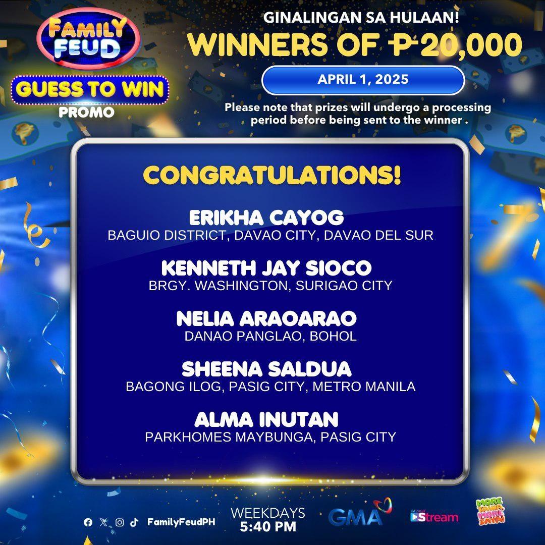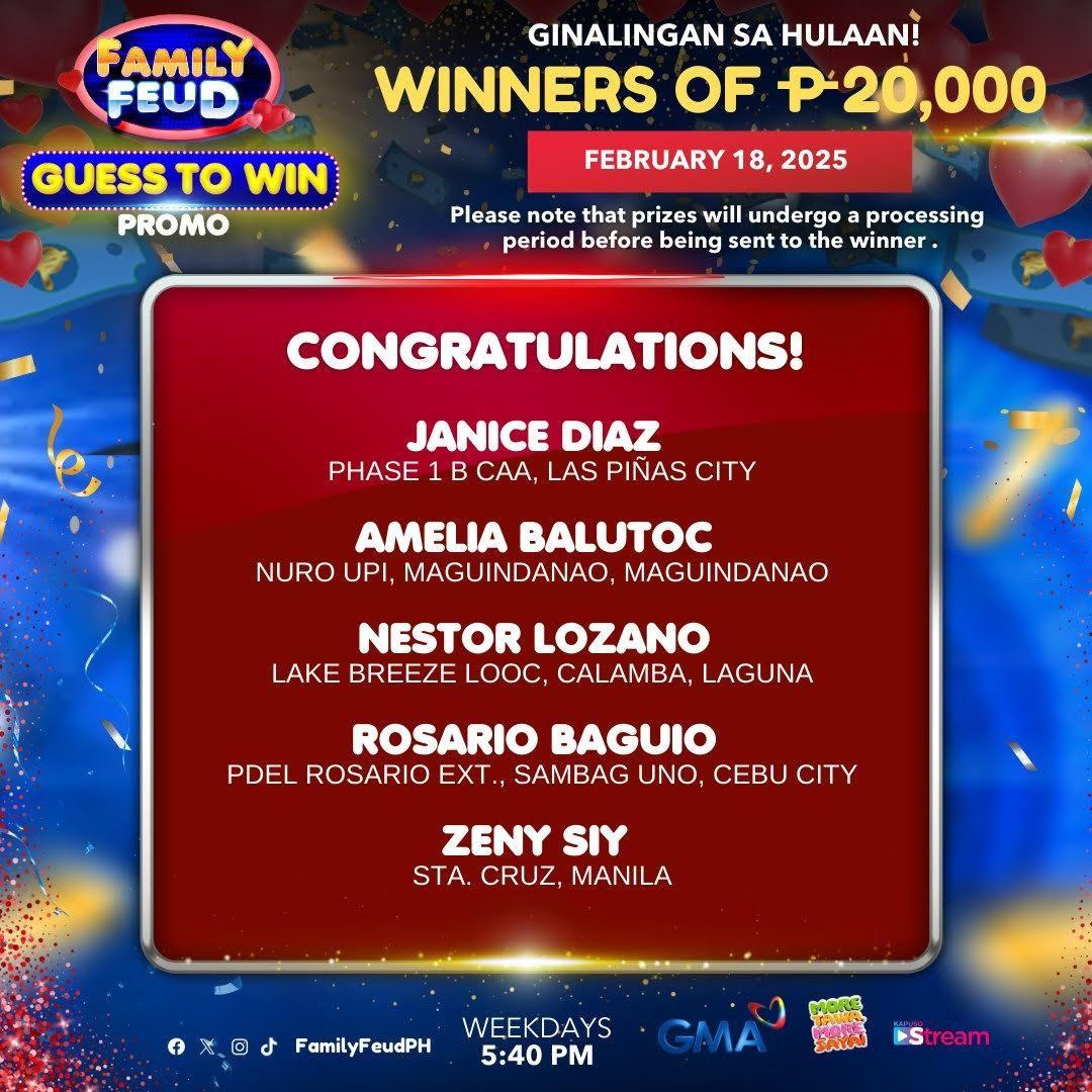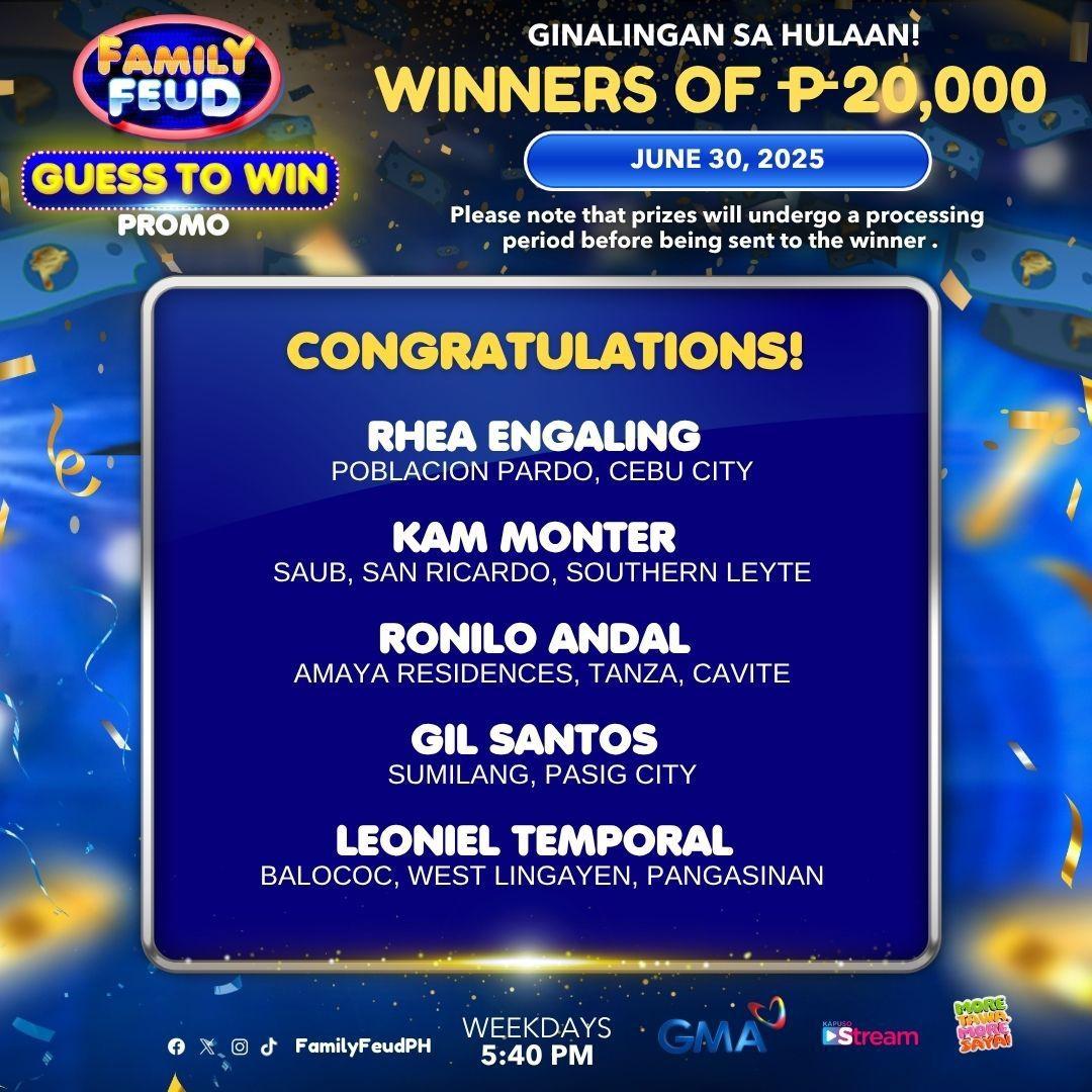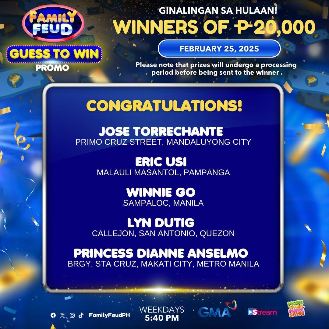 Narito ang mga listahan ng mga nagwagi sa Family Feud "Guess To Win" Promo.