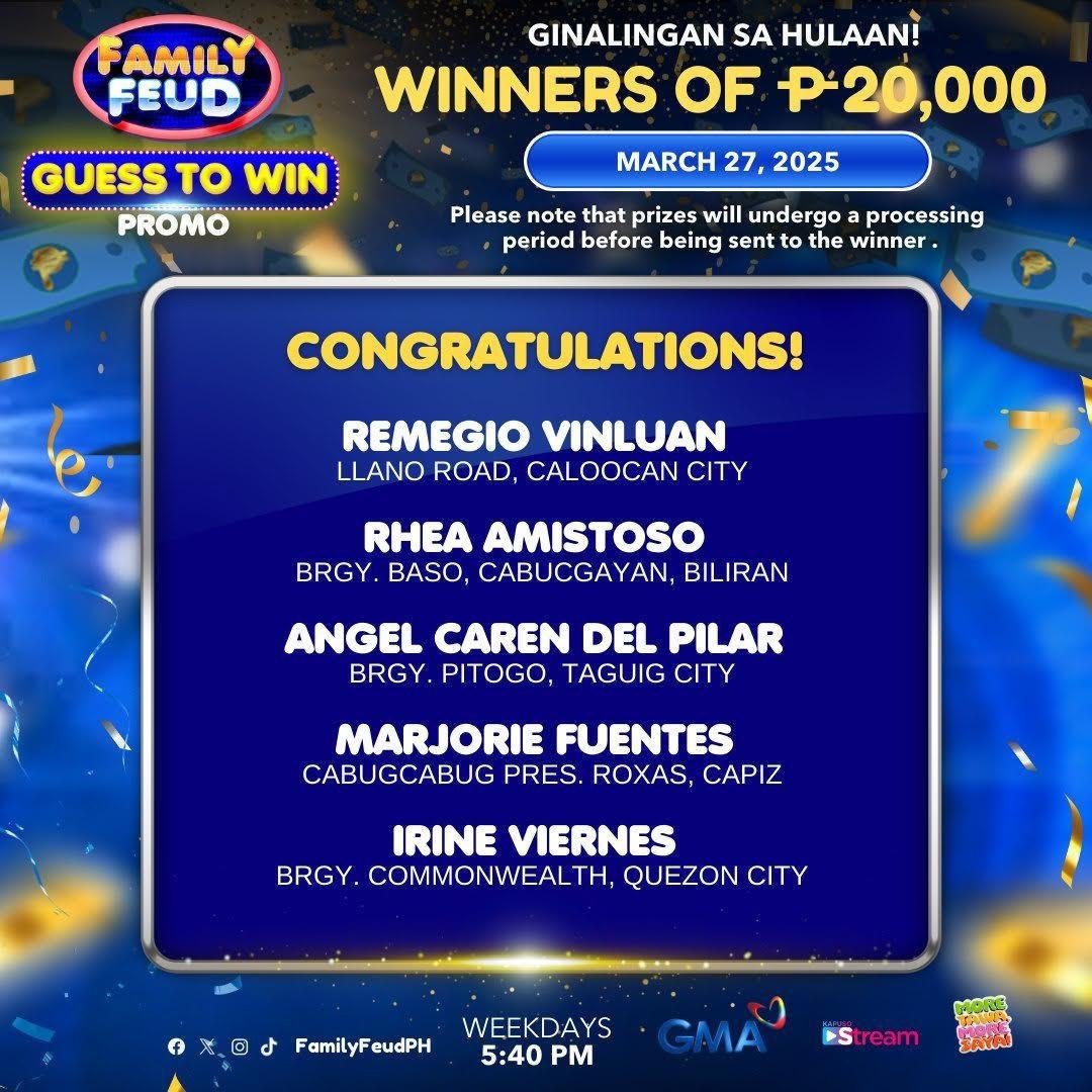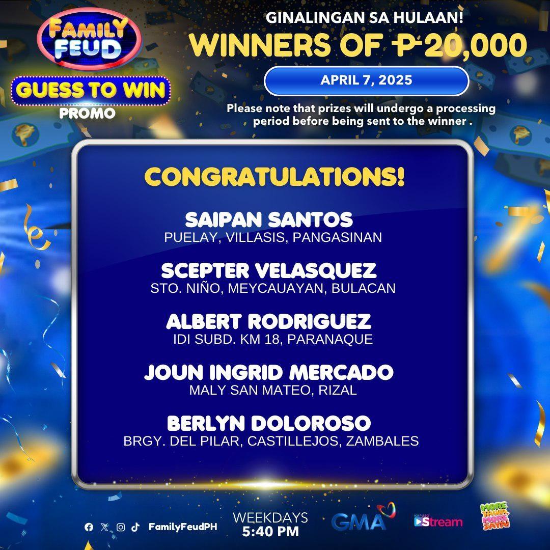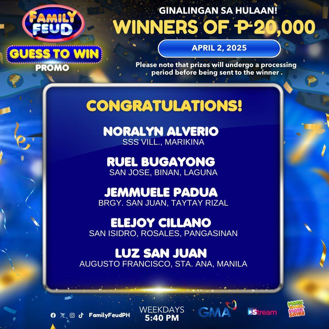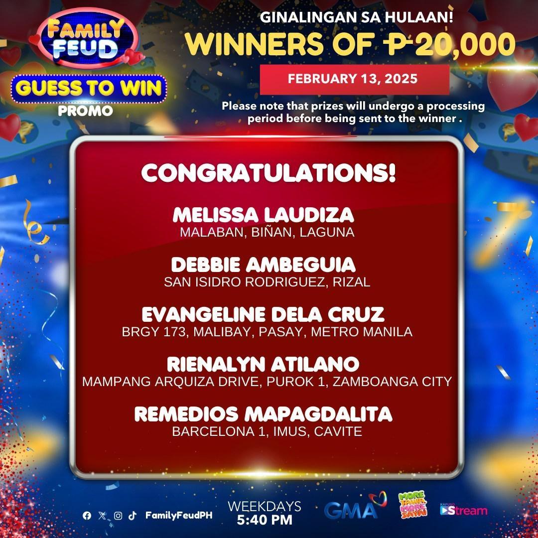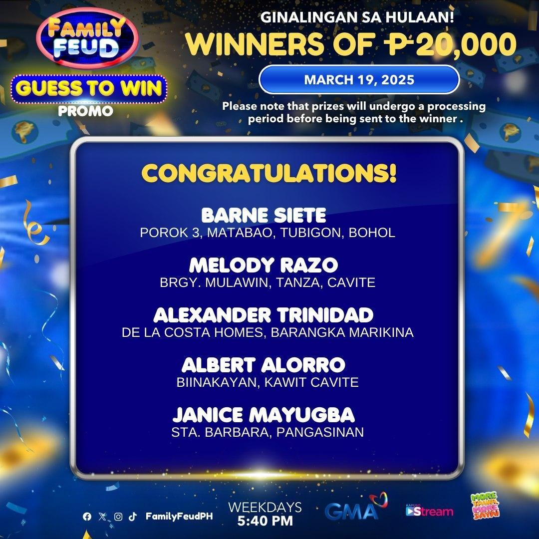 Narito ang mga listahan ng mga nagwagi sa Family Feud "Guess To Win" Promo.