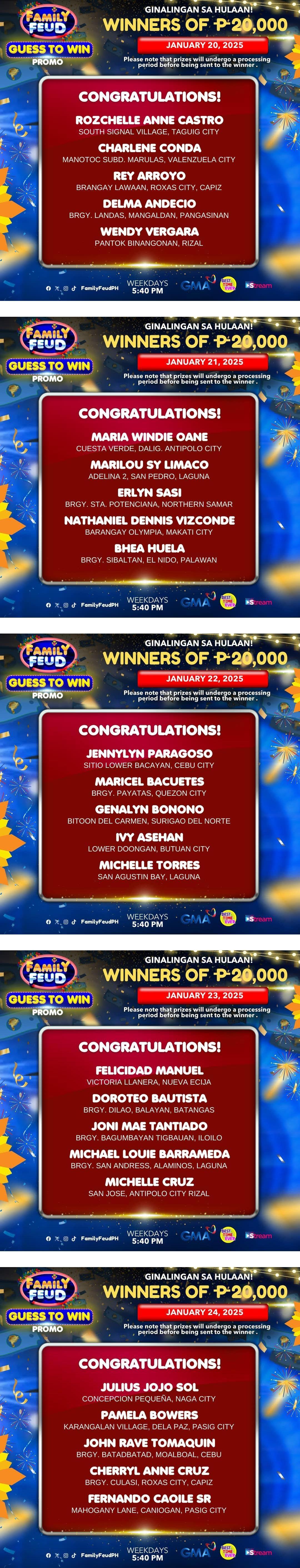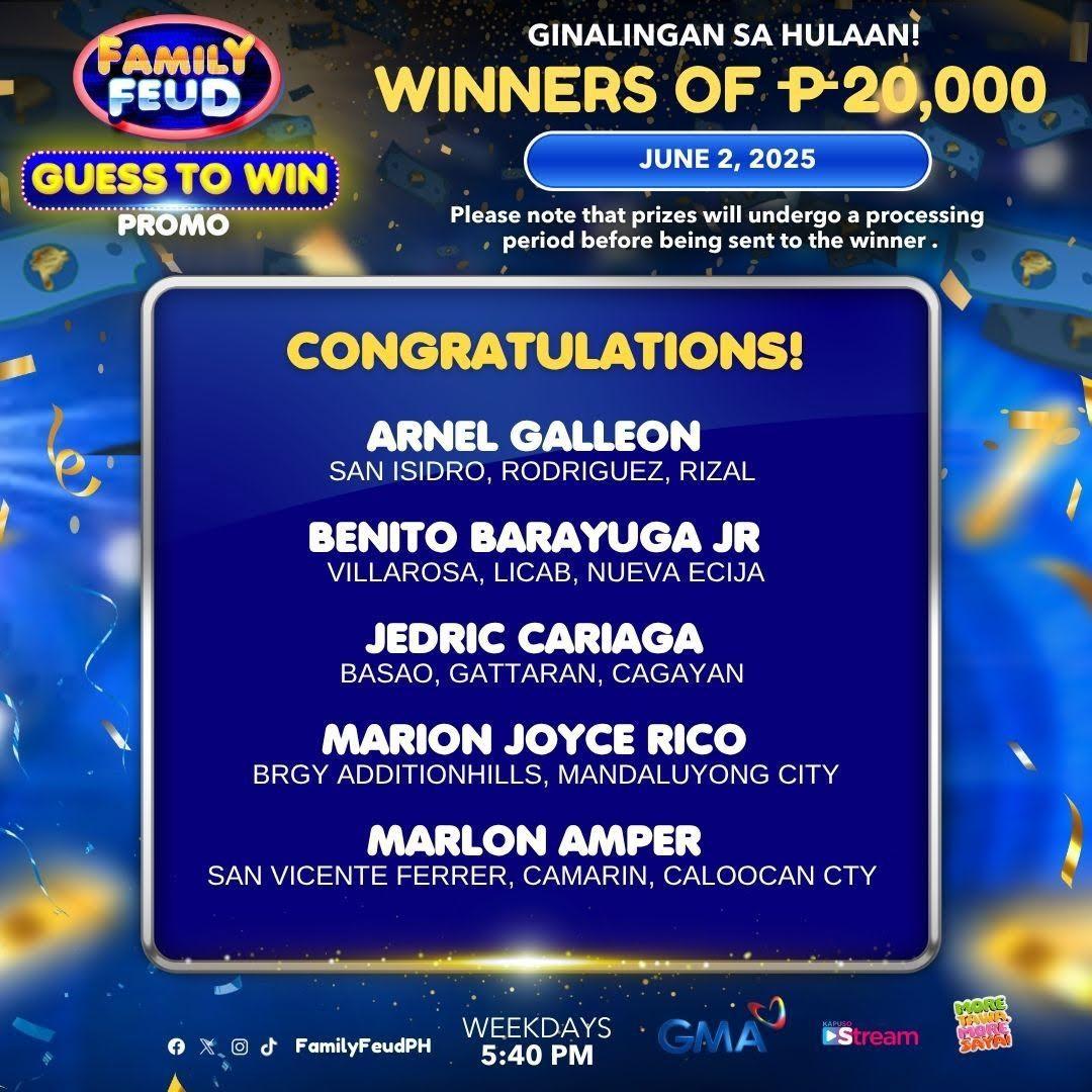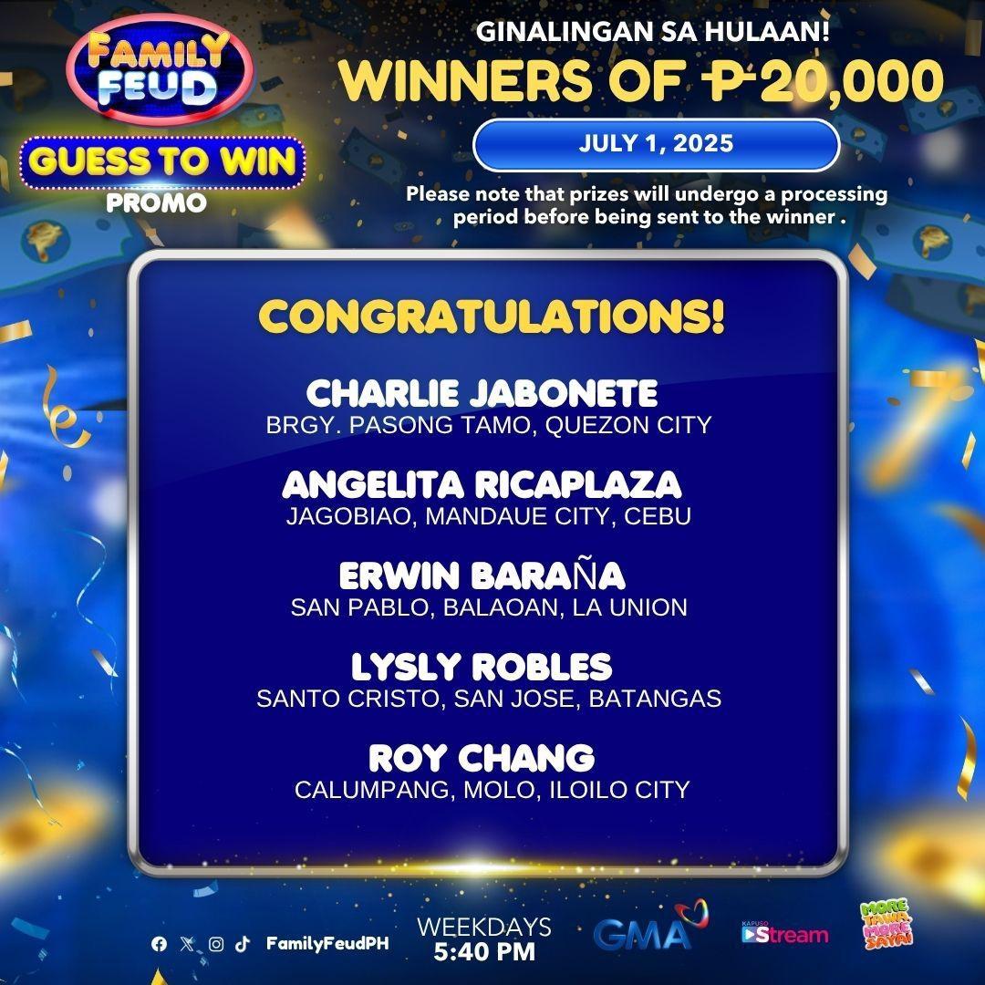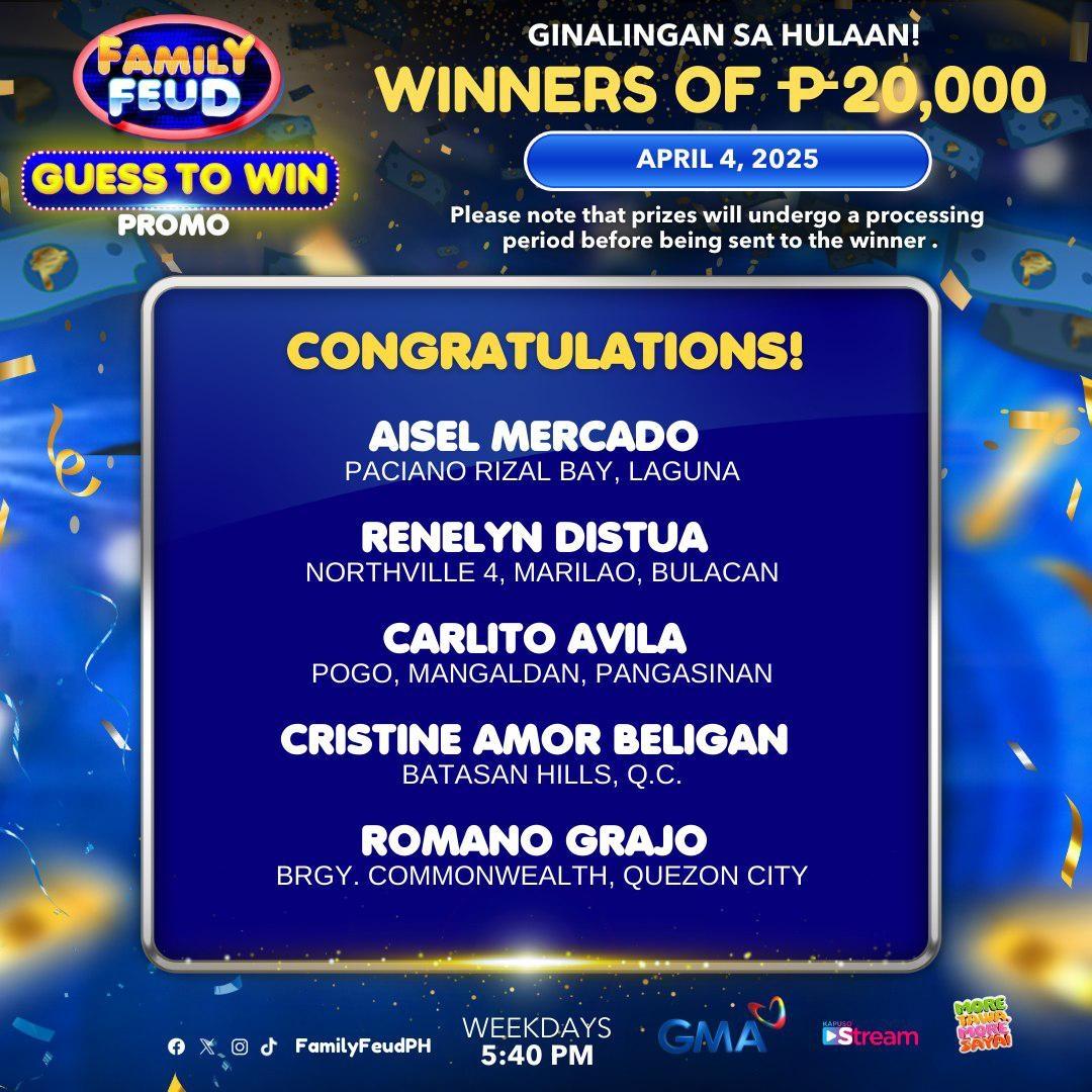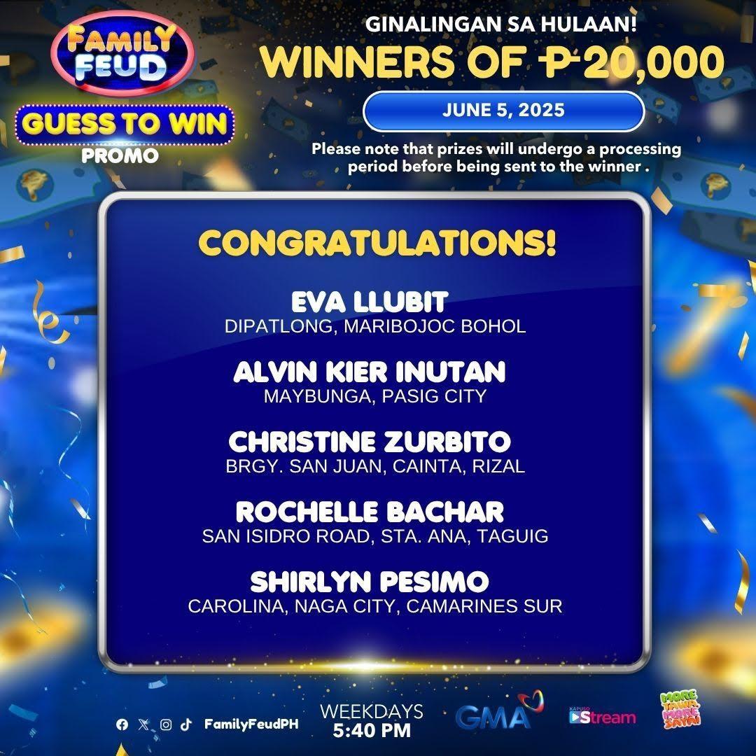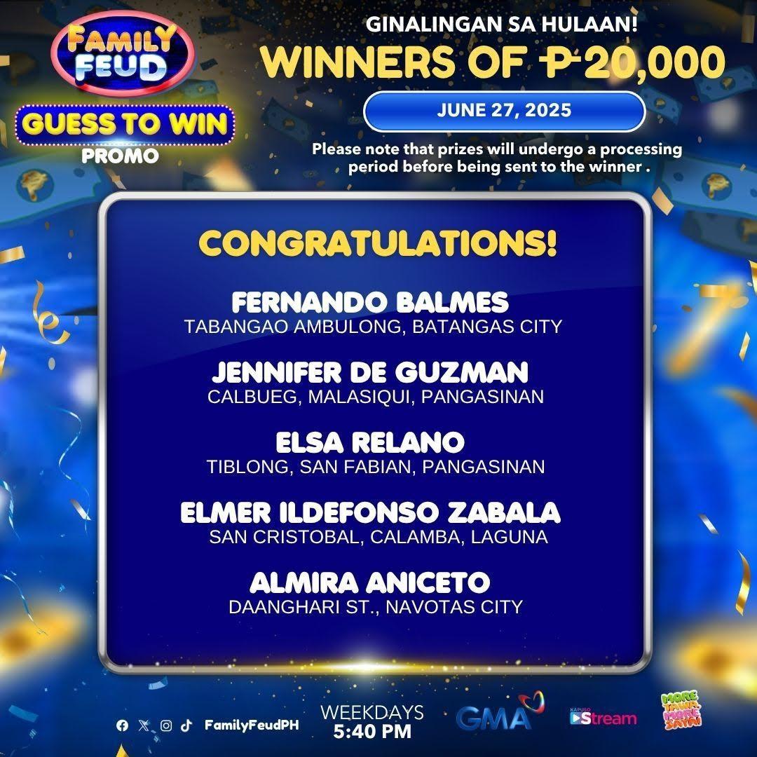 Narito ang mga listahan ng mga nagwagi sa Family Feud "Guess To Win" Promo.