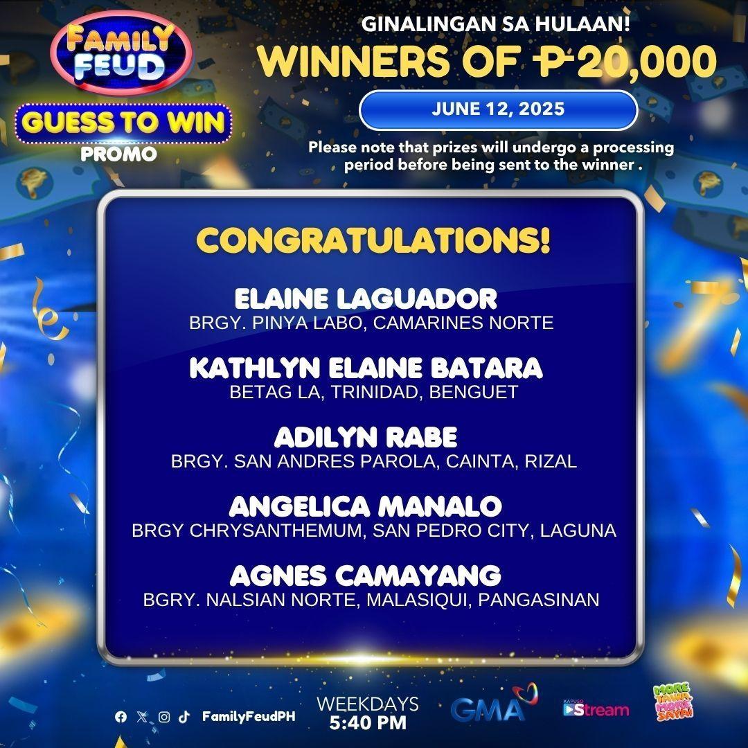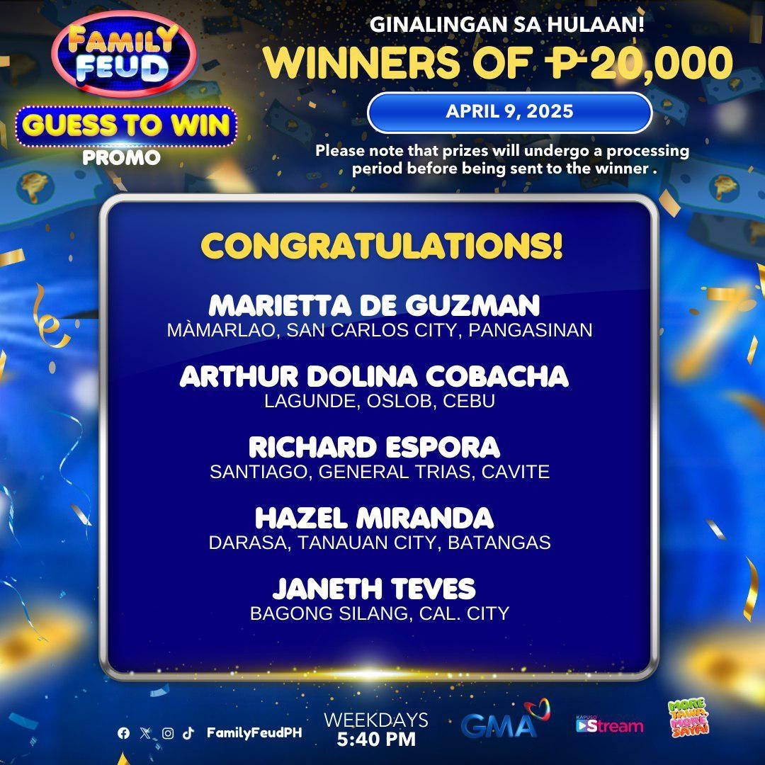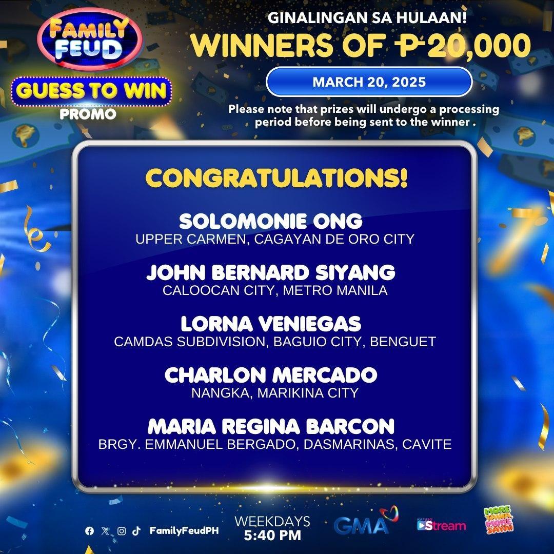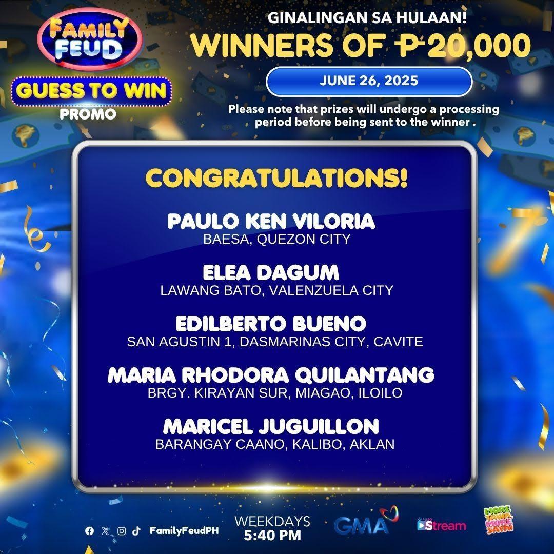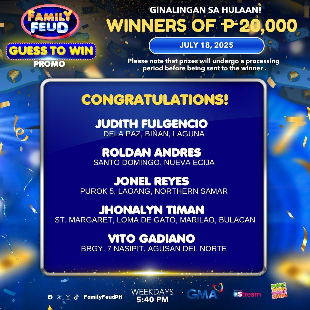 Narito ang mga listahan ng mga nagwagi sa Family Feud "Guess To Win" Promo.