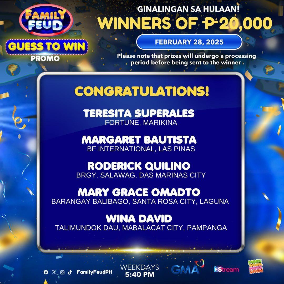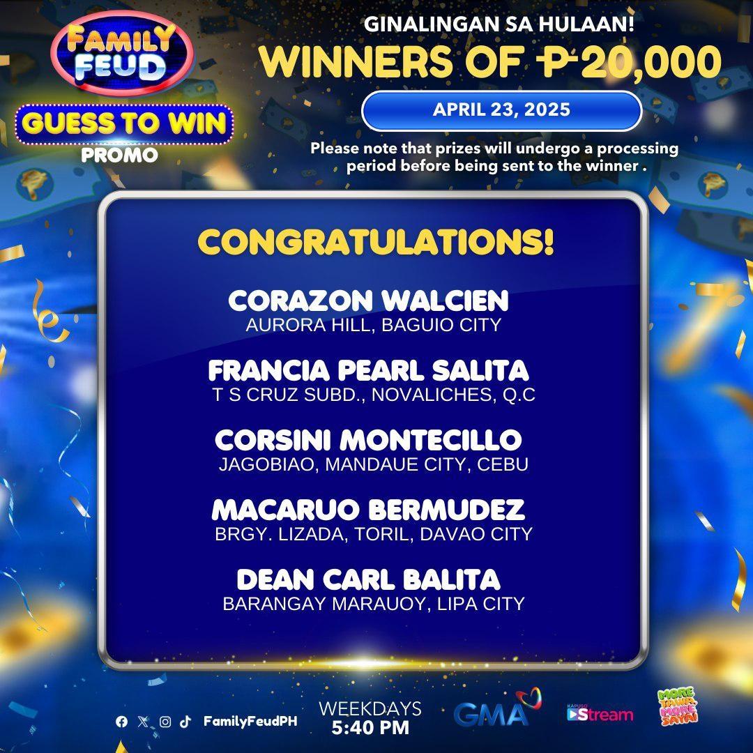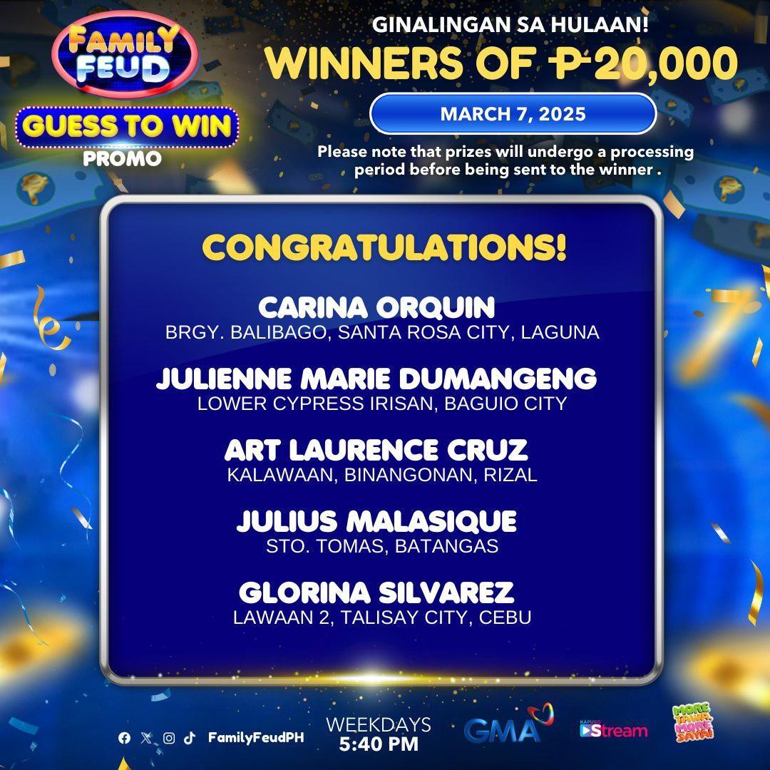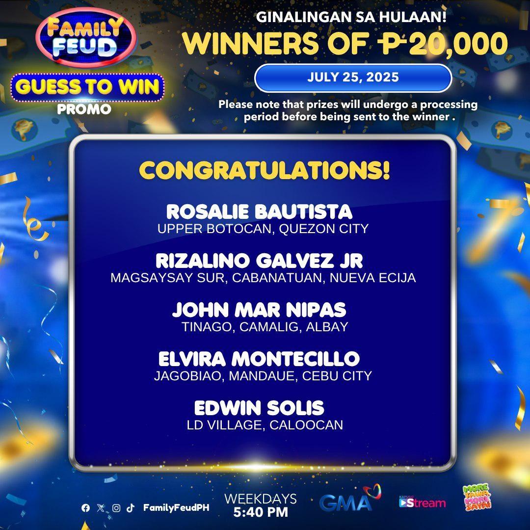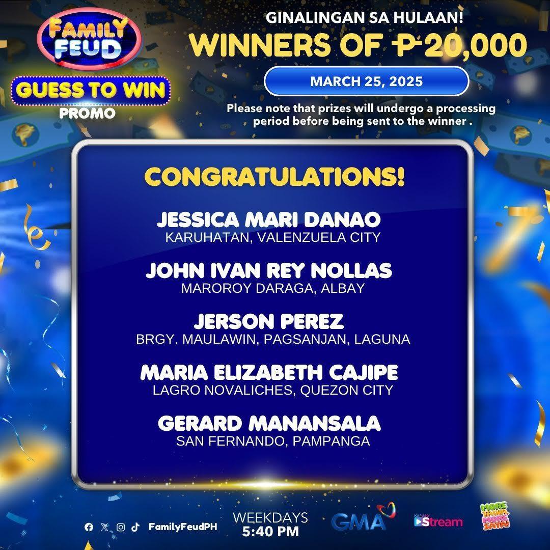 Narito ang mga listahan ng mga nagwagi sa Family Feud "Guess To Win" Promo.