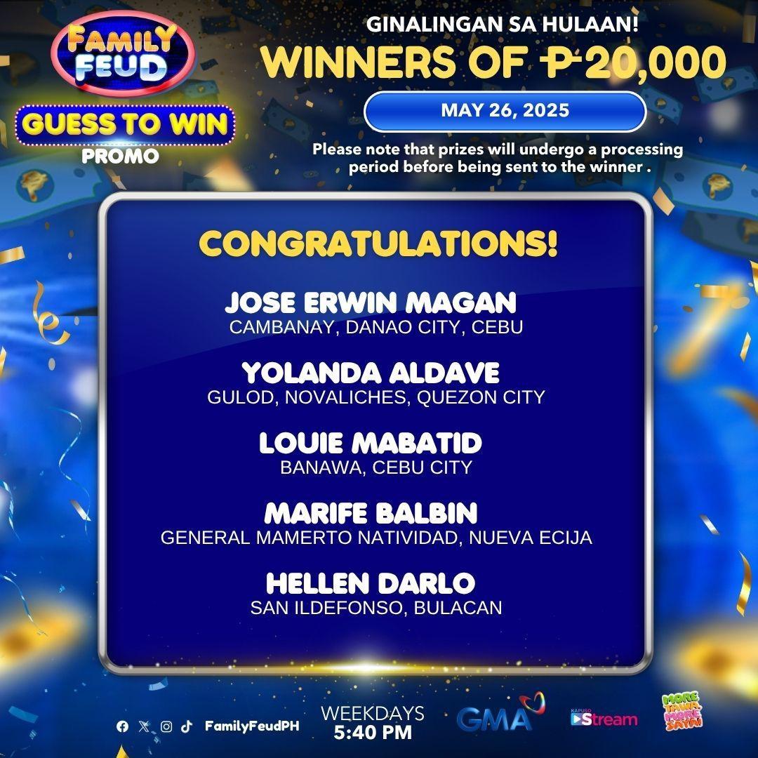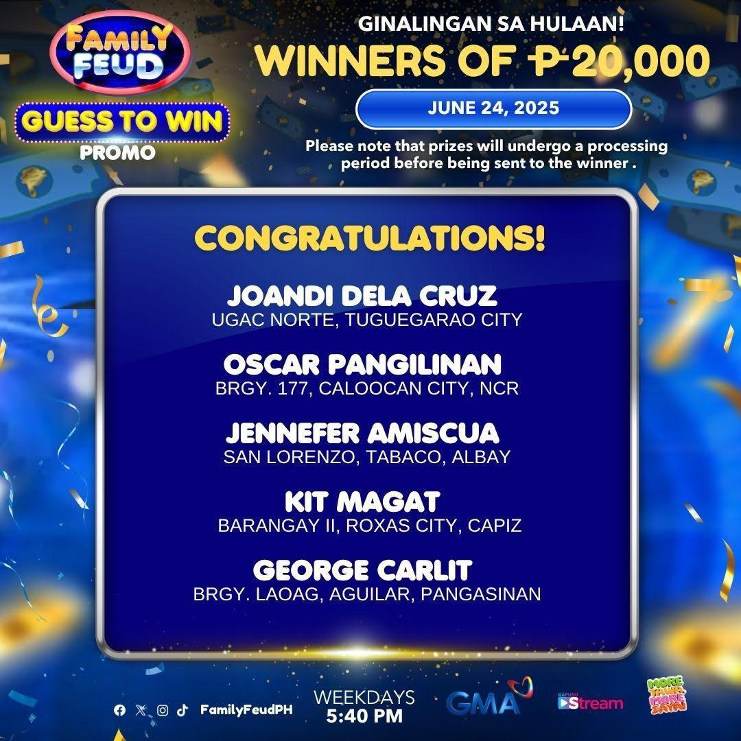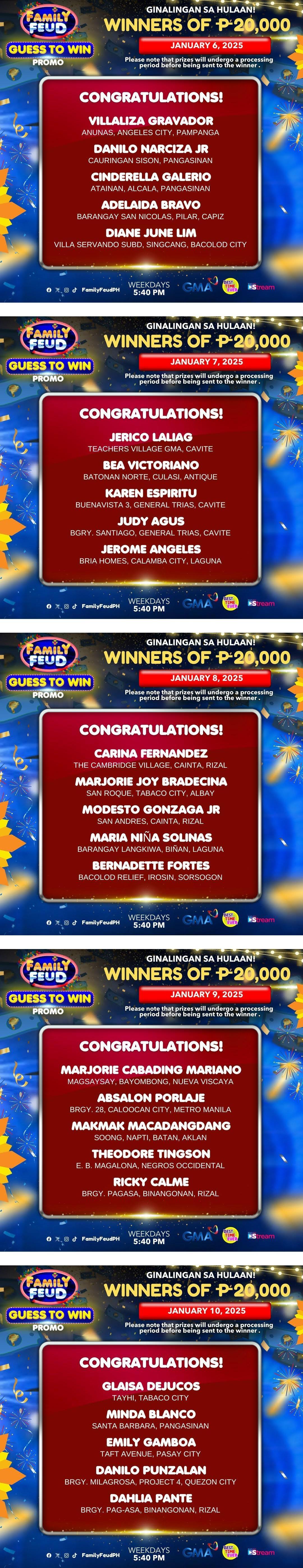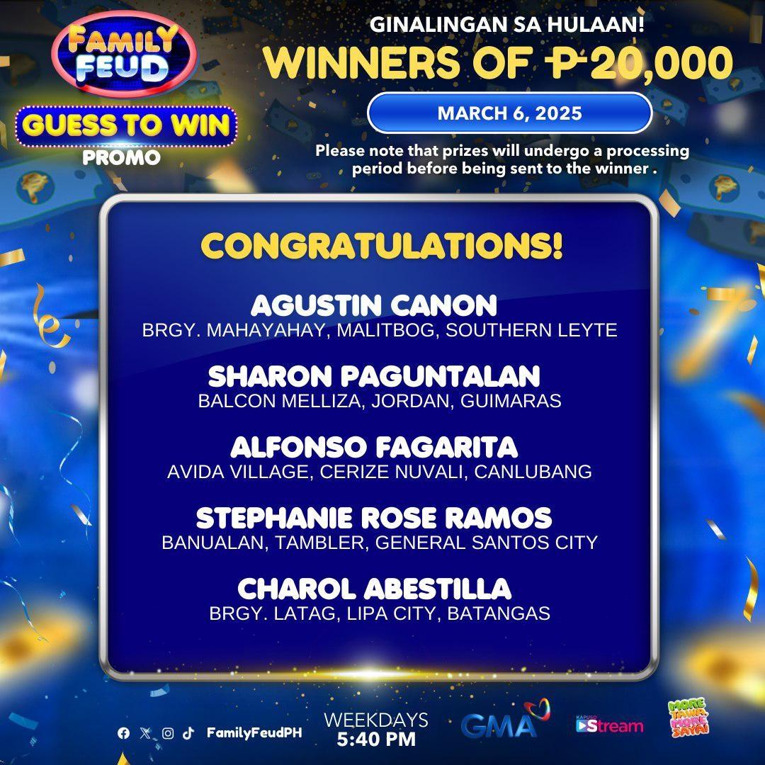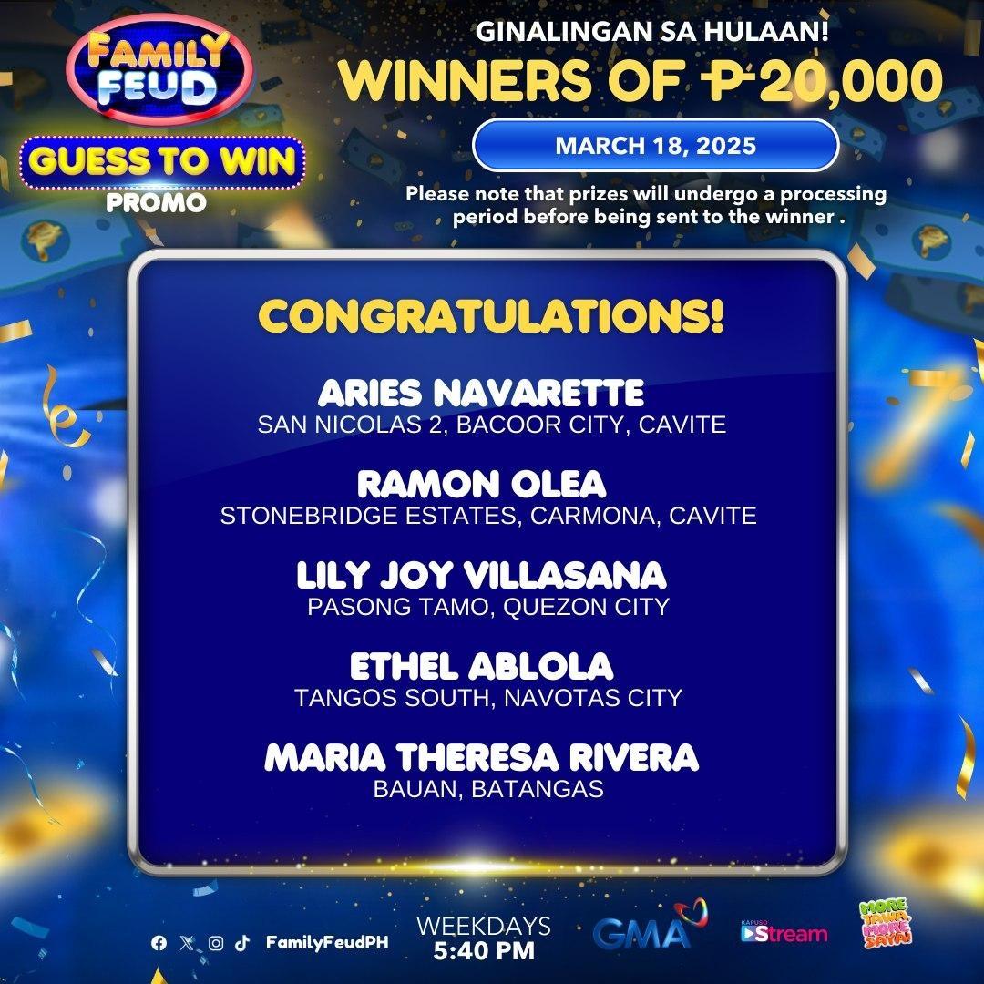 Narito ang mga listahan ng mga nagwagi sa Family Feud "Guess To Win" Promo.