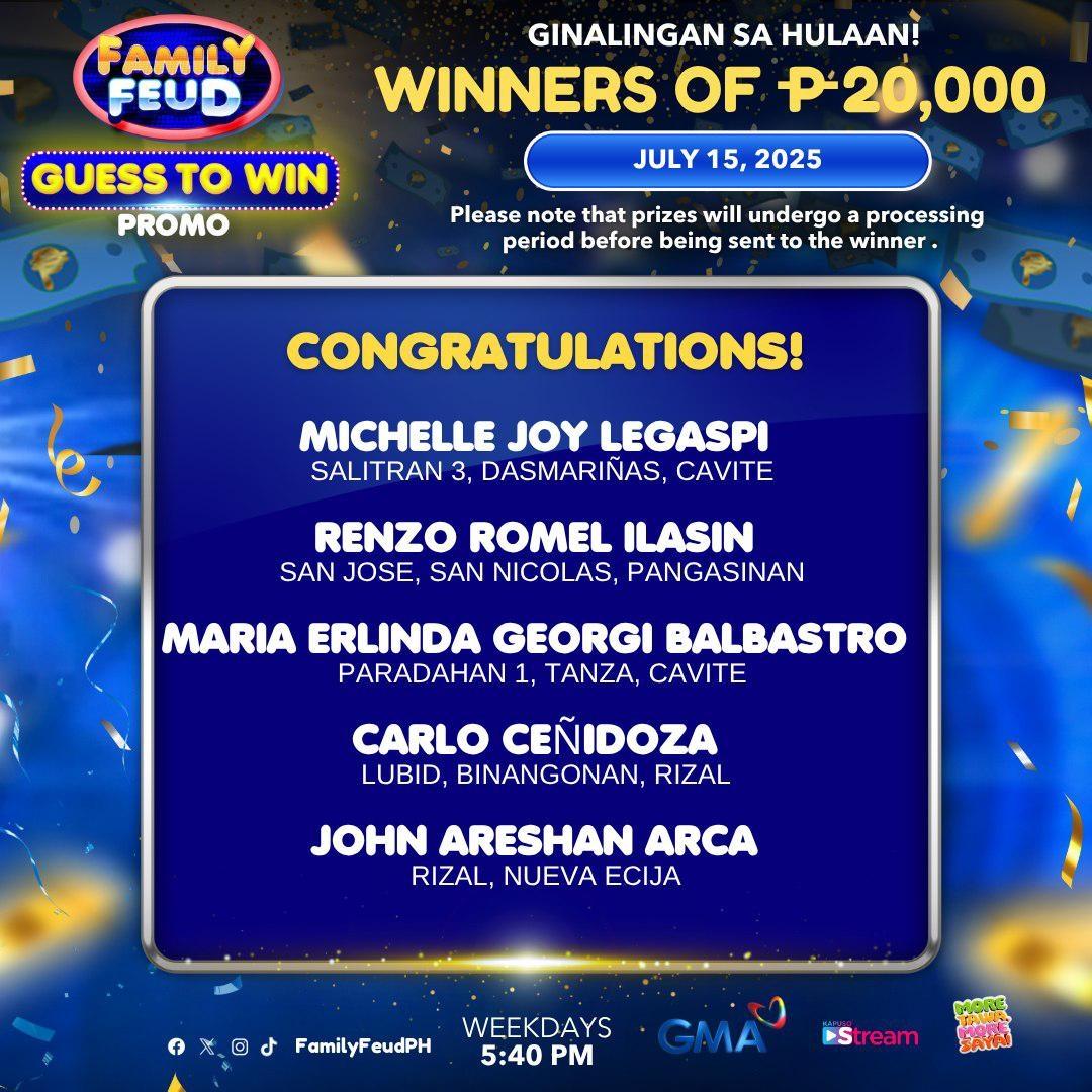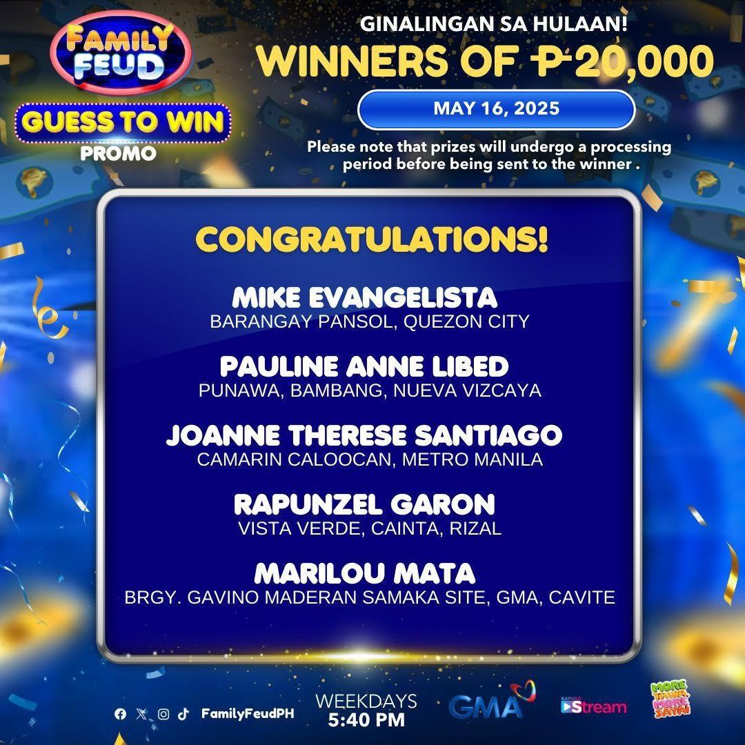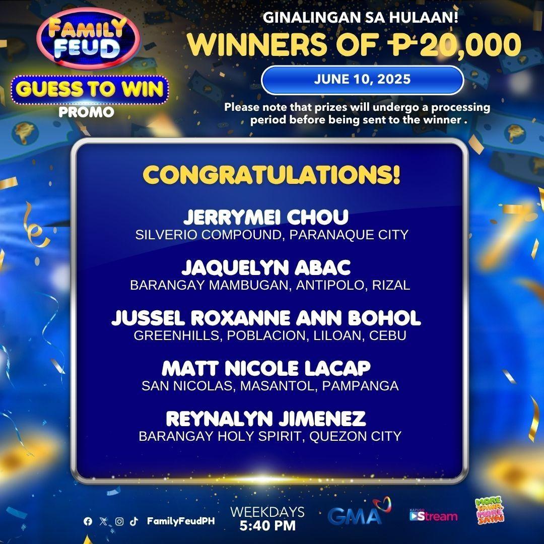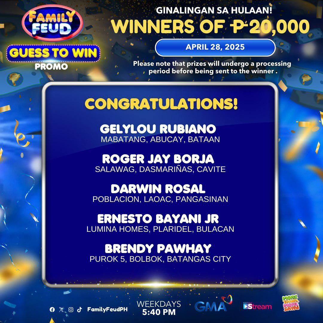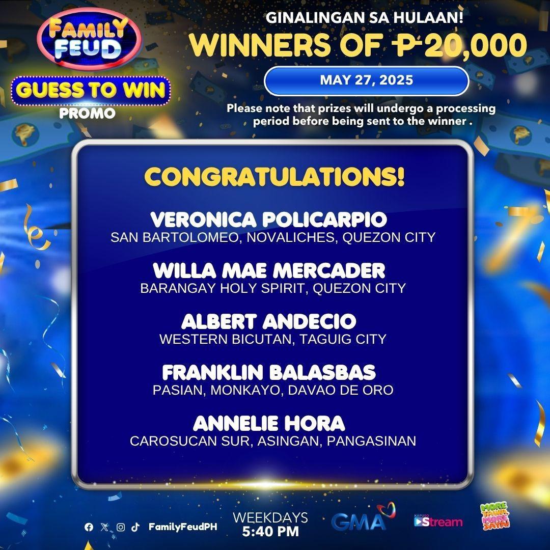 Narito ang mga listahan ng mga nagwagi sa Family Feud "Guess To Win" Promo.