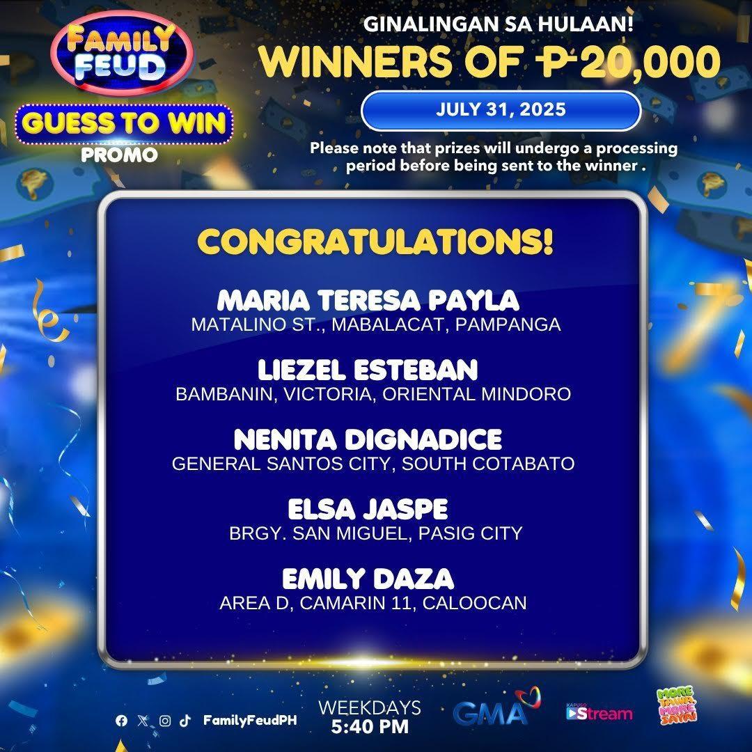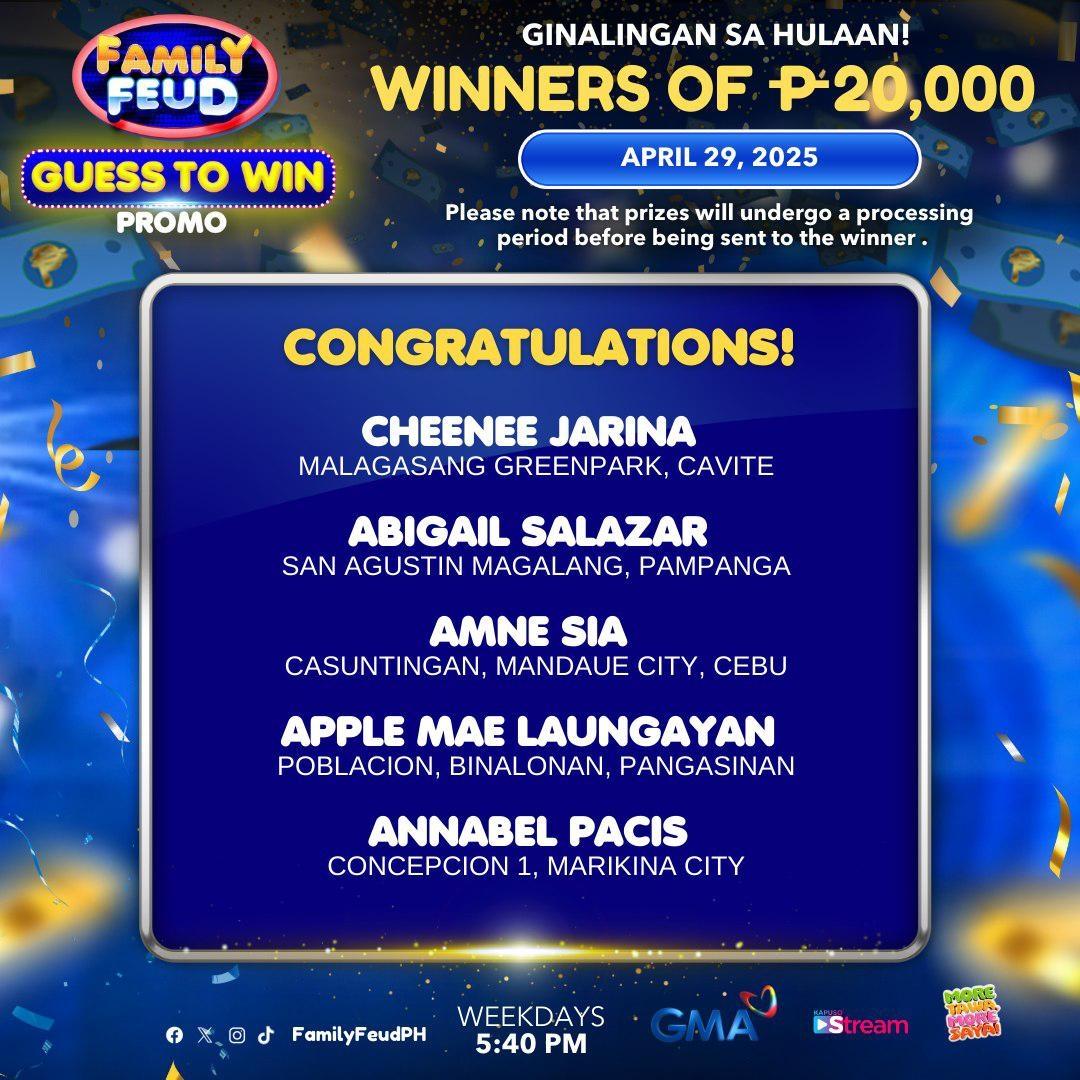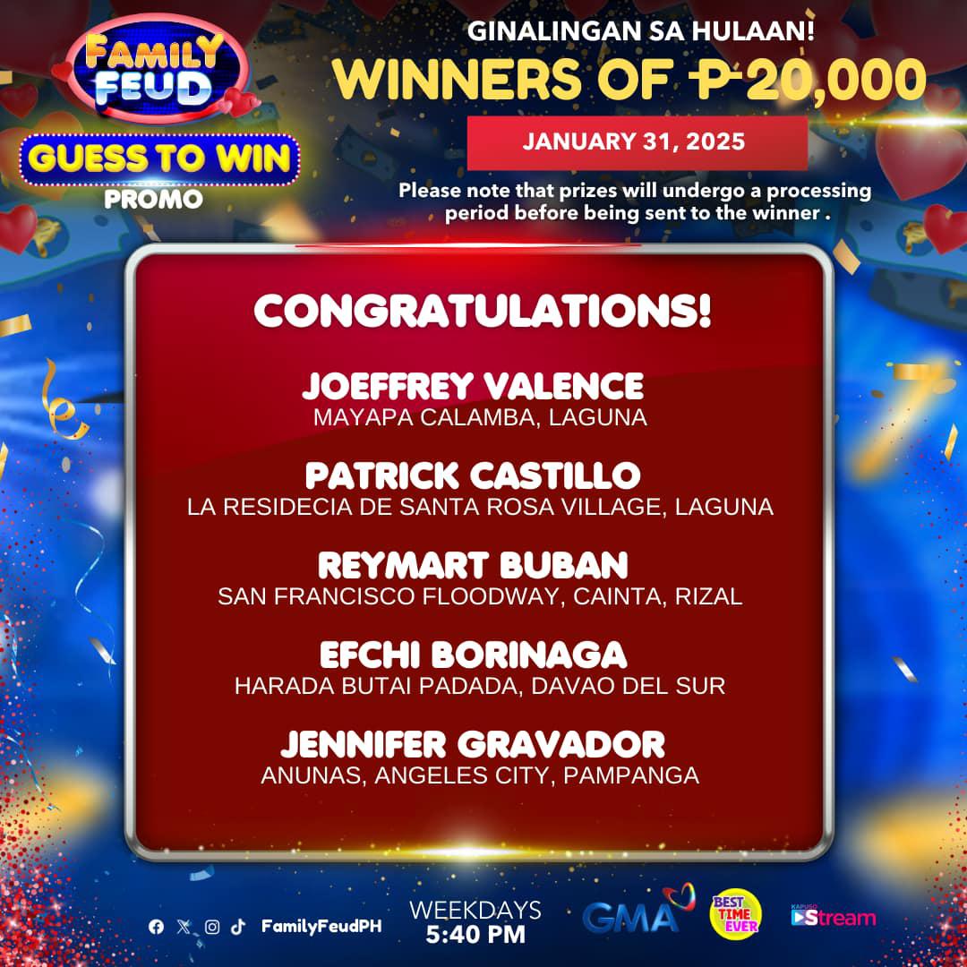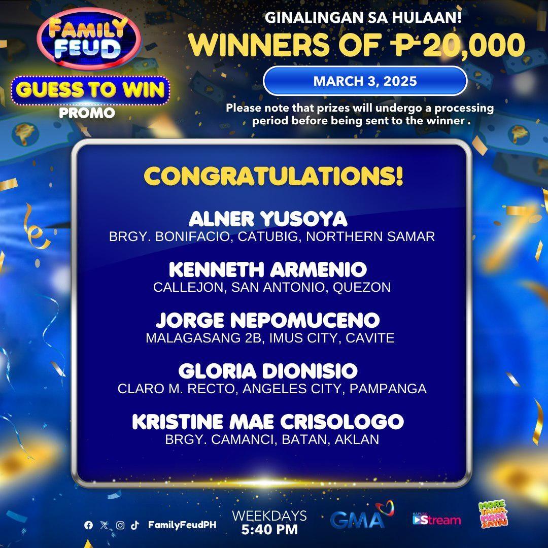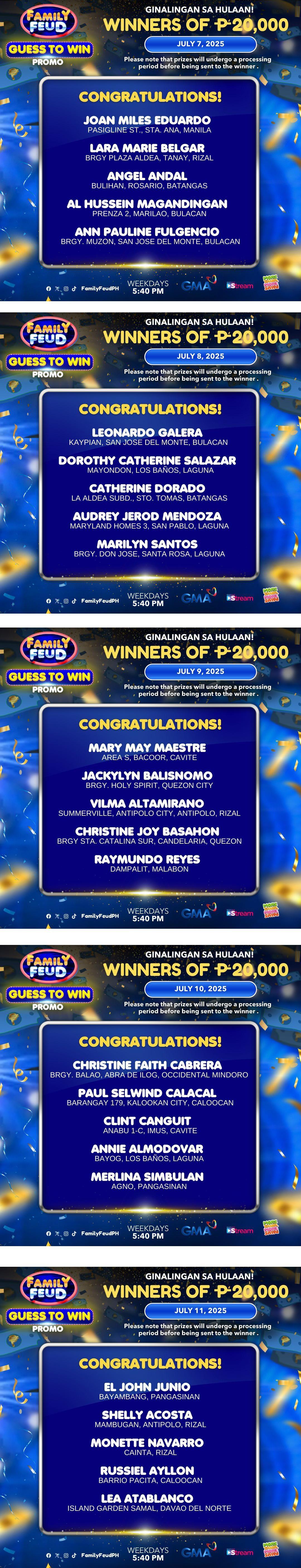 Narito ang mga listahan ng mga nagwagi sa Family Feud "Guess To Win" Promo.