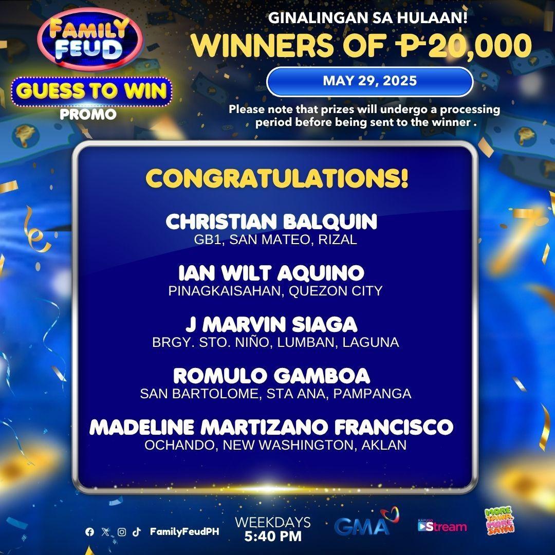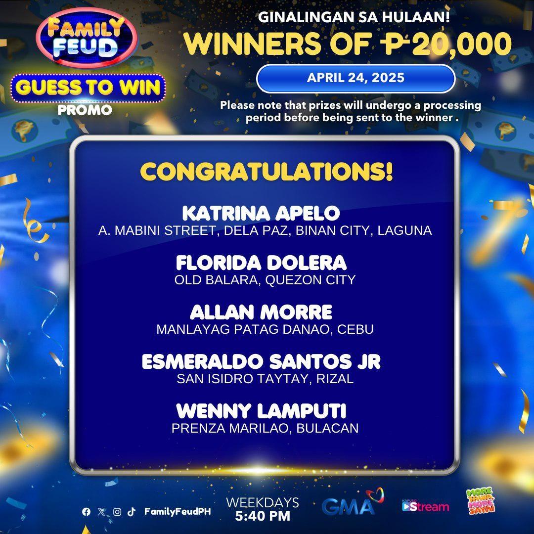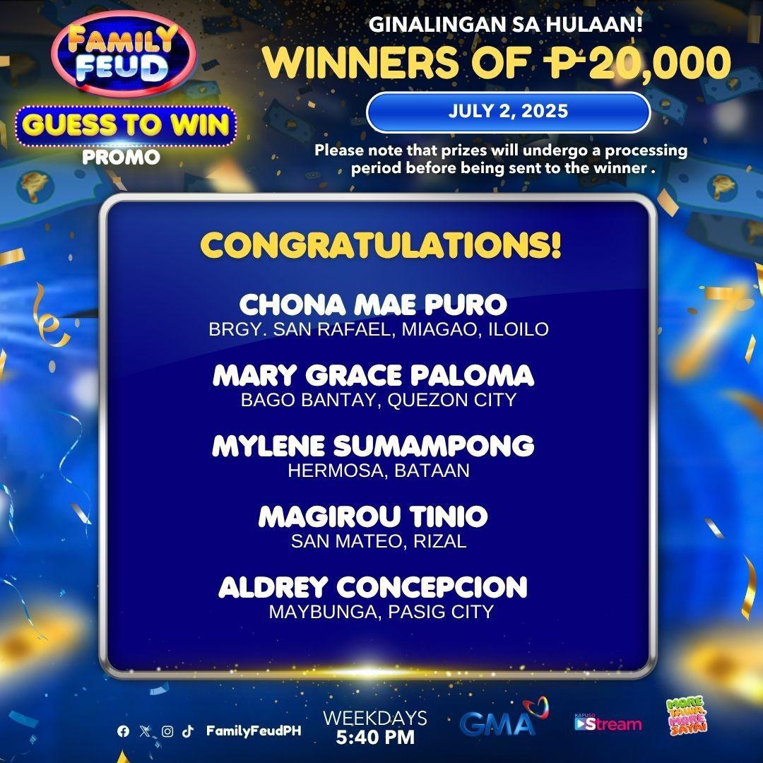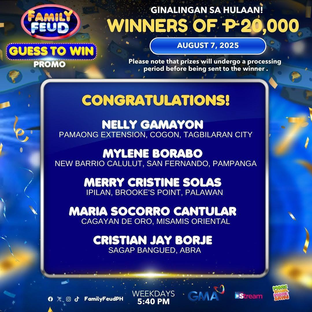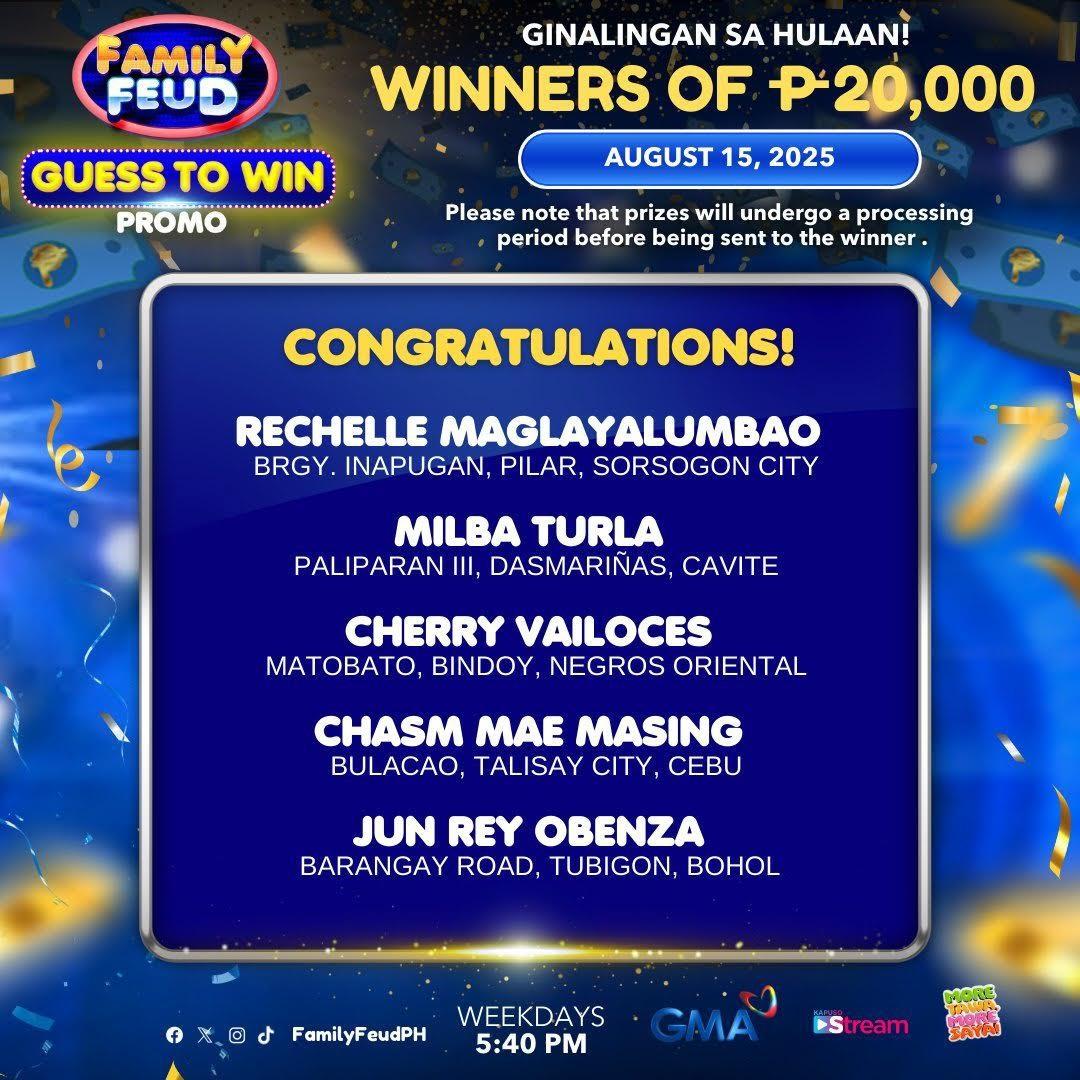 Narito ang mga listahan ng mga nagwagi sa Family Feud "Guess To Win" Promo.