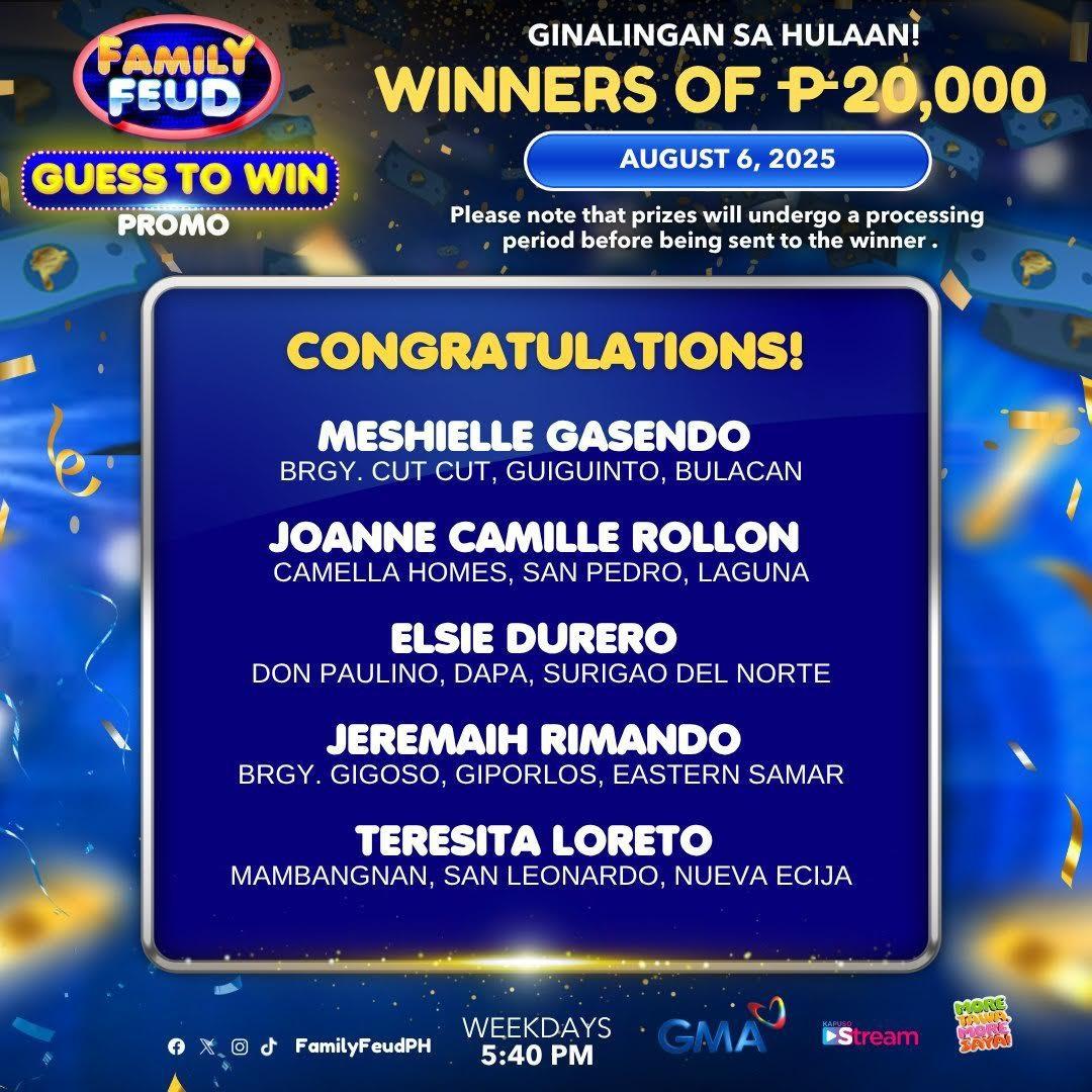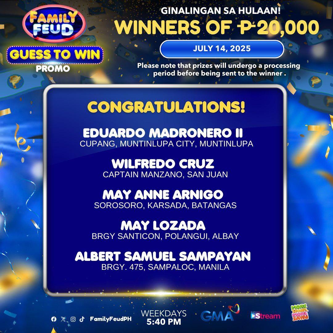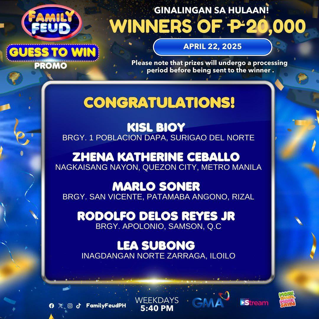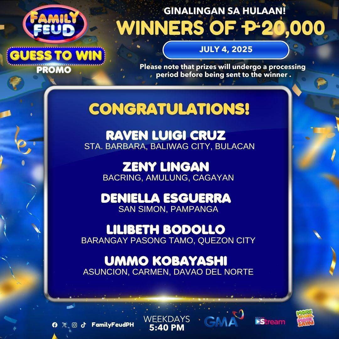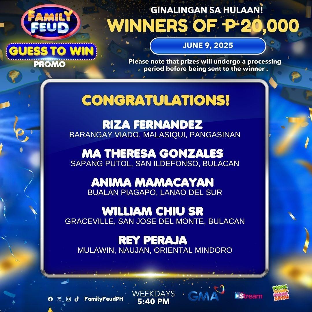Narito ang mga listahan ng mga nagwagi sa Family Feud "Guess To Win" Promo.
