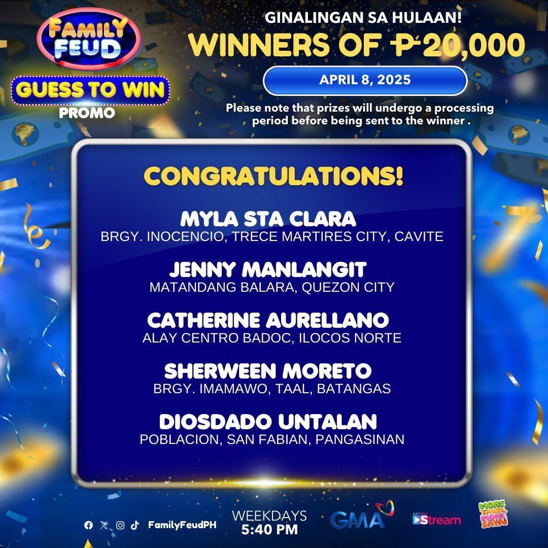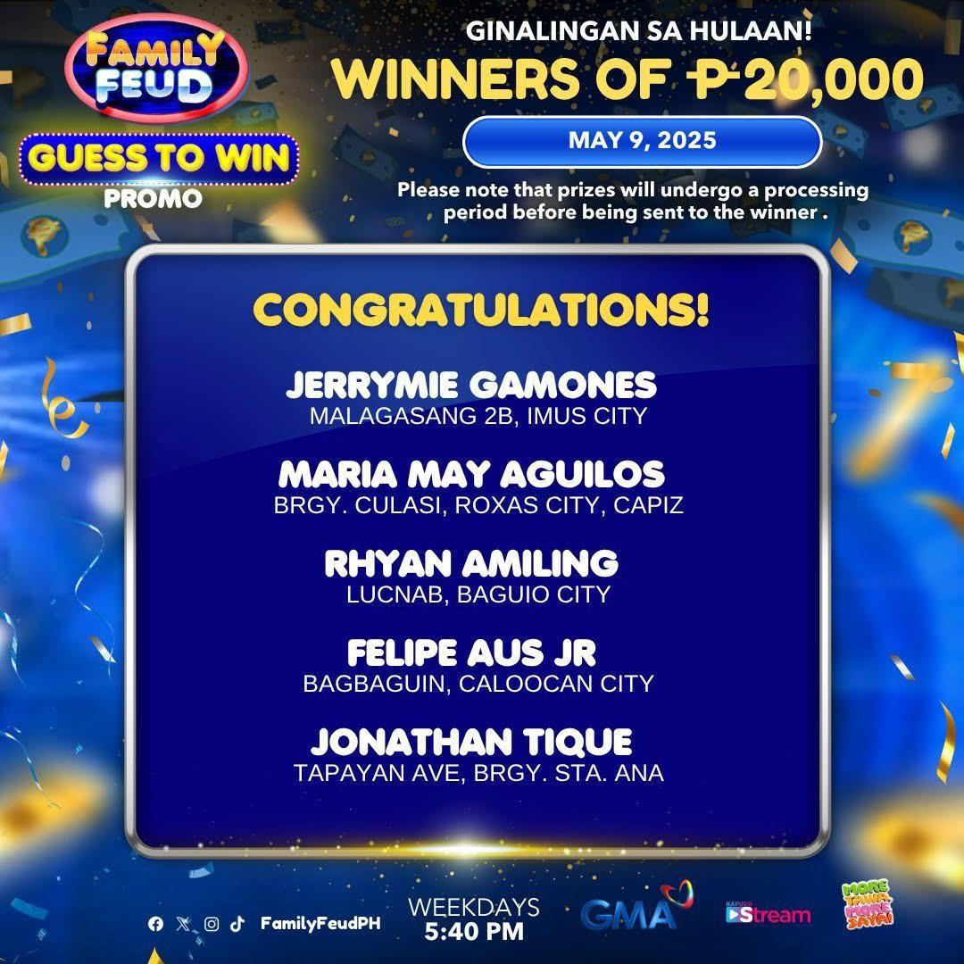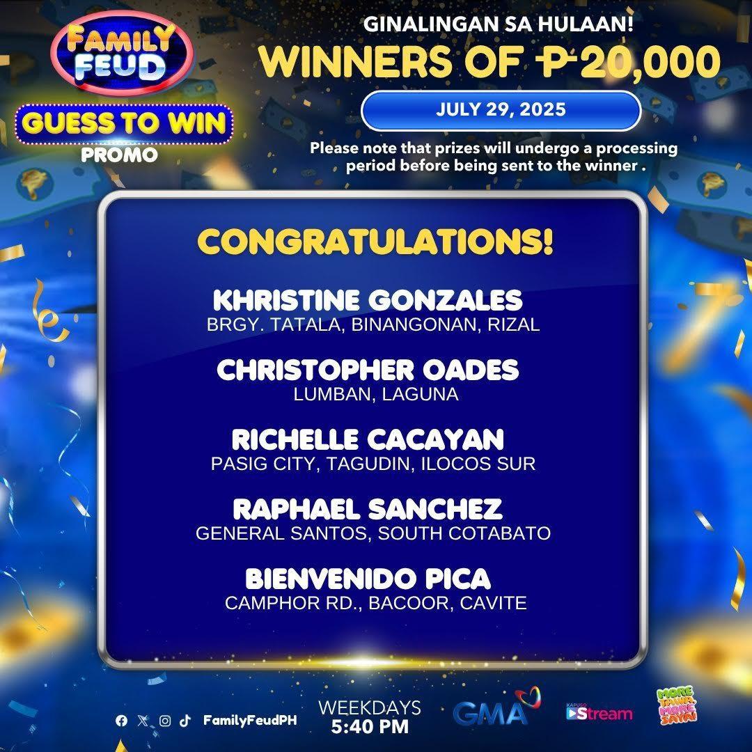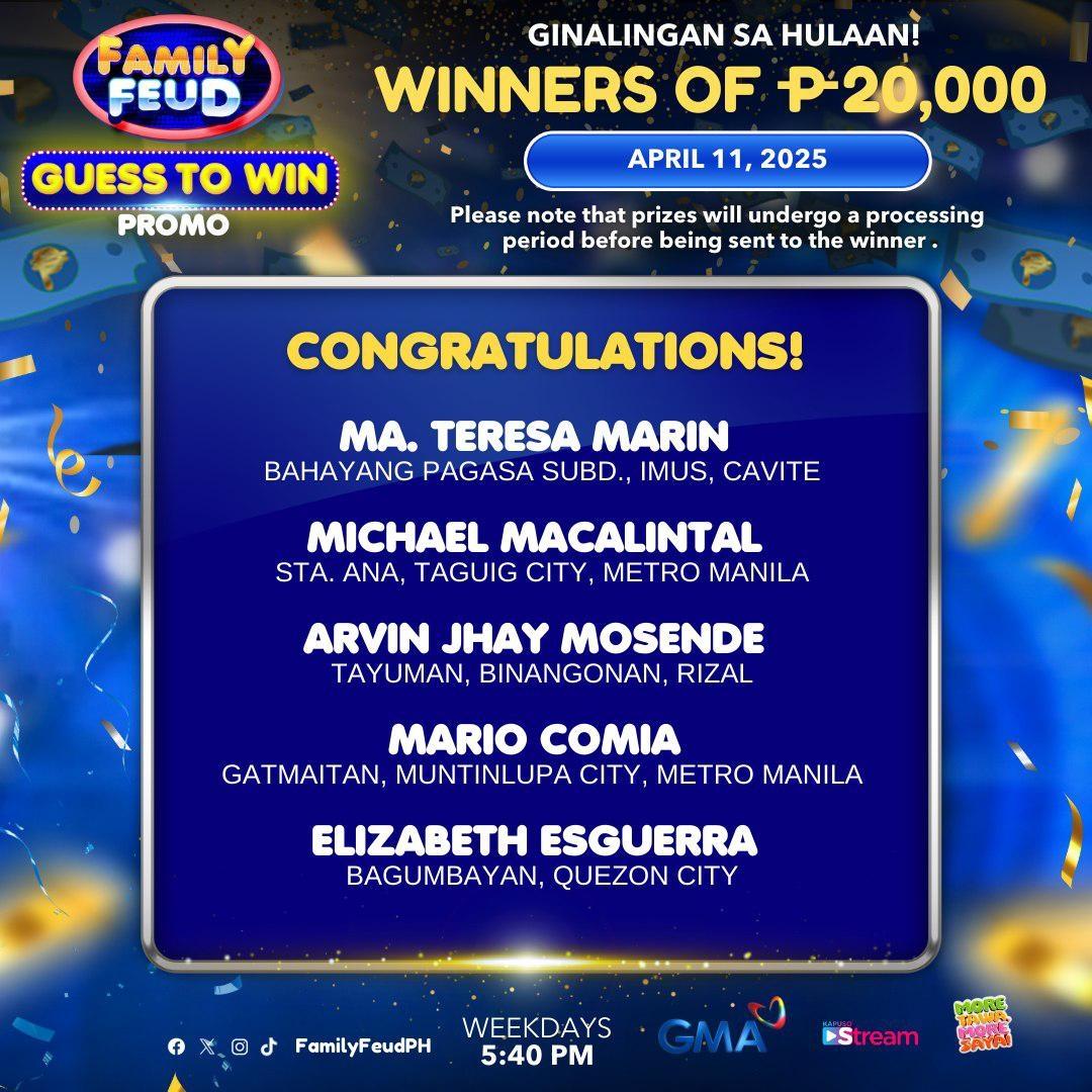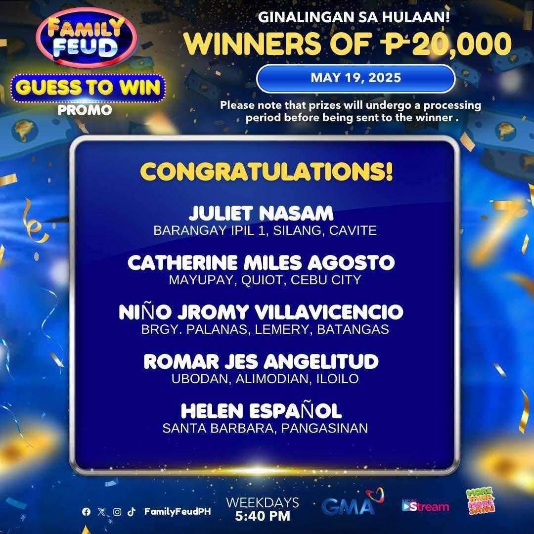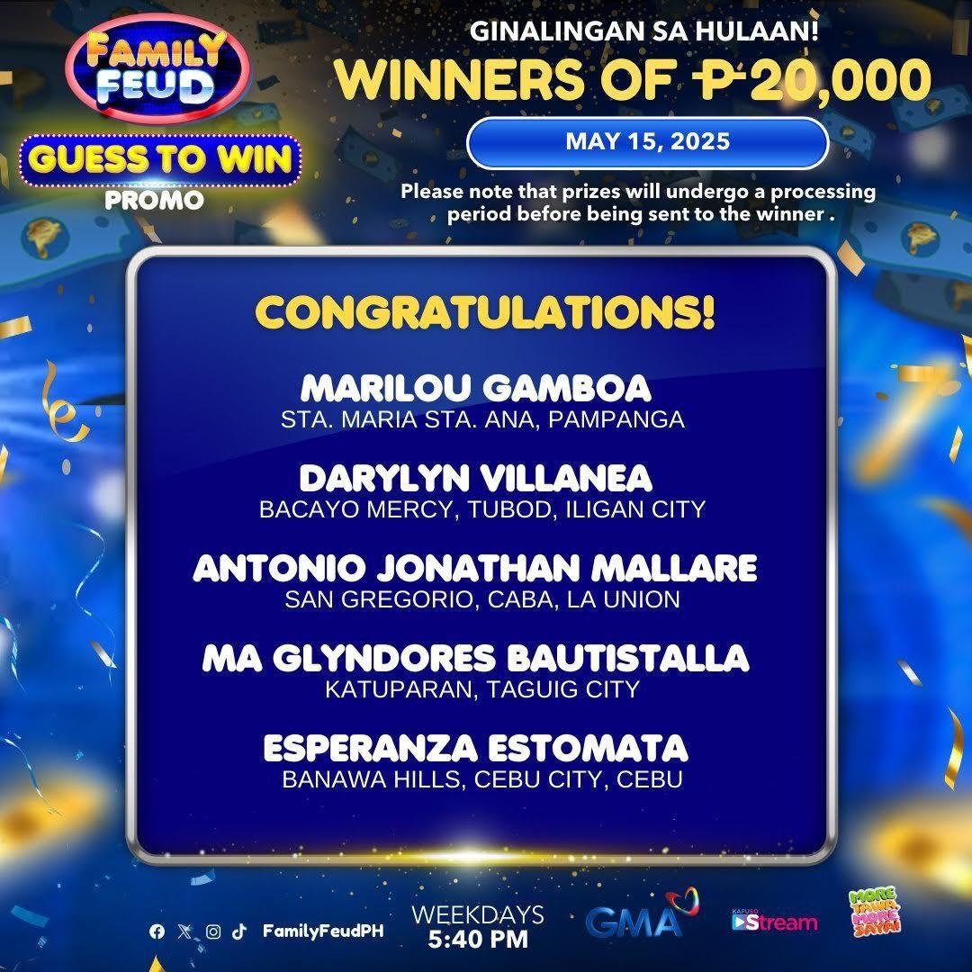 Narito ang mga listahan ng mga nagwagi sa Family Feud "Guess To Win" Promo.