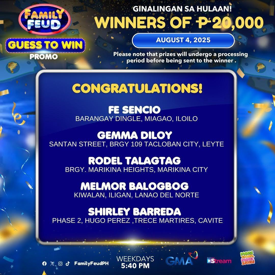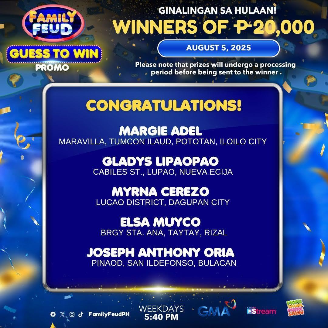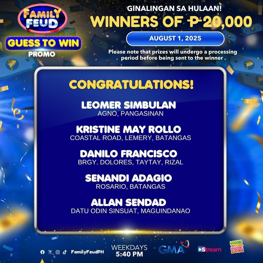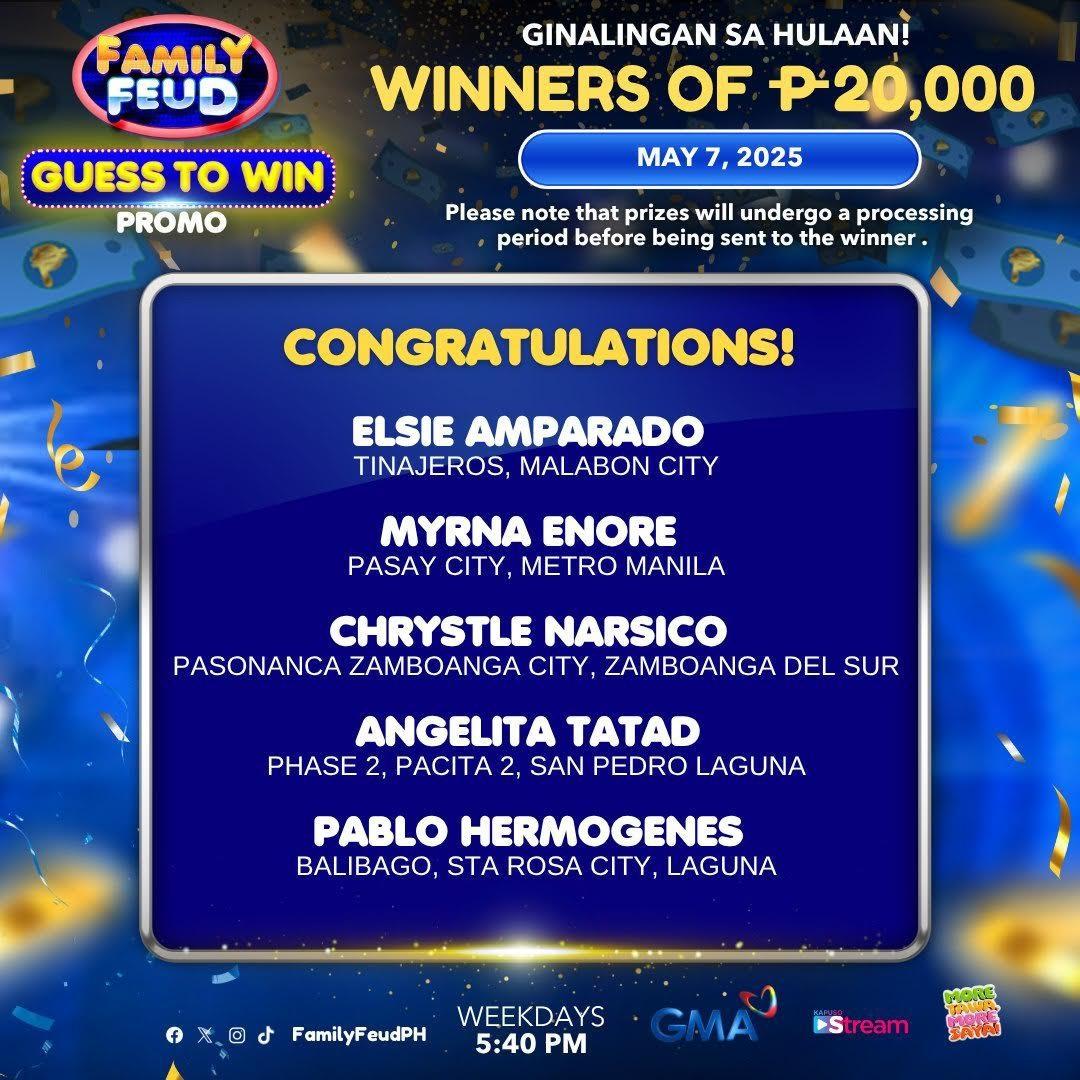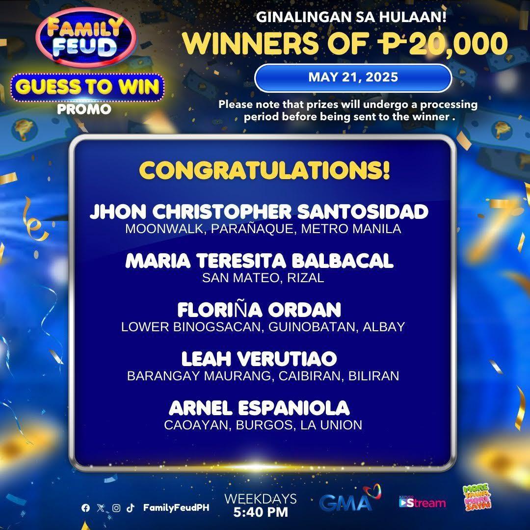 Narito ang mga listahan ng mga nagwagi sa Family Feud "Guess To Win" Promo.