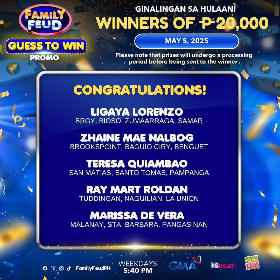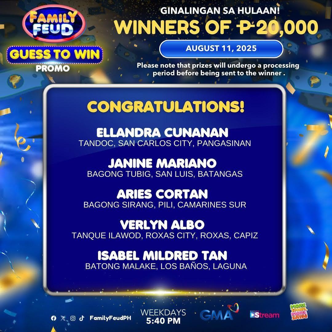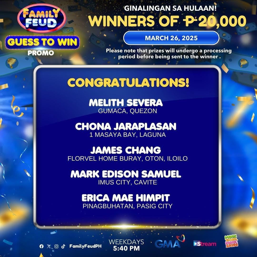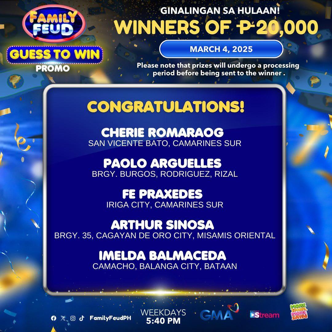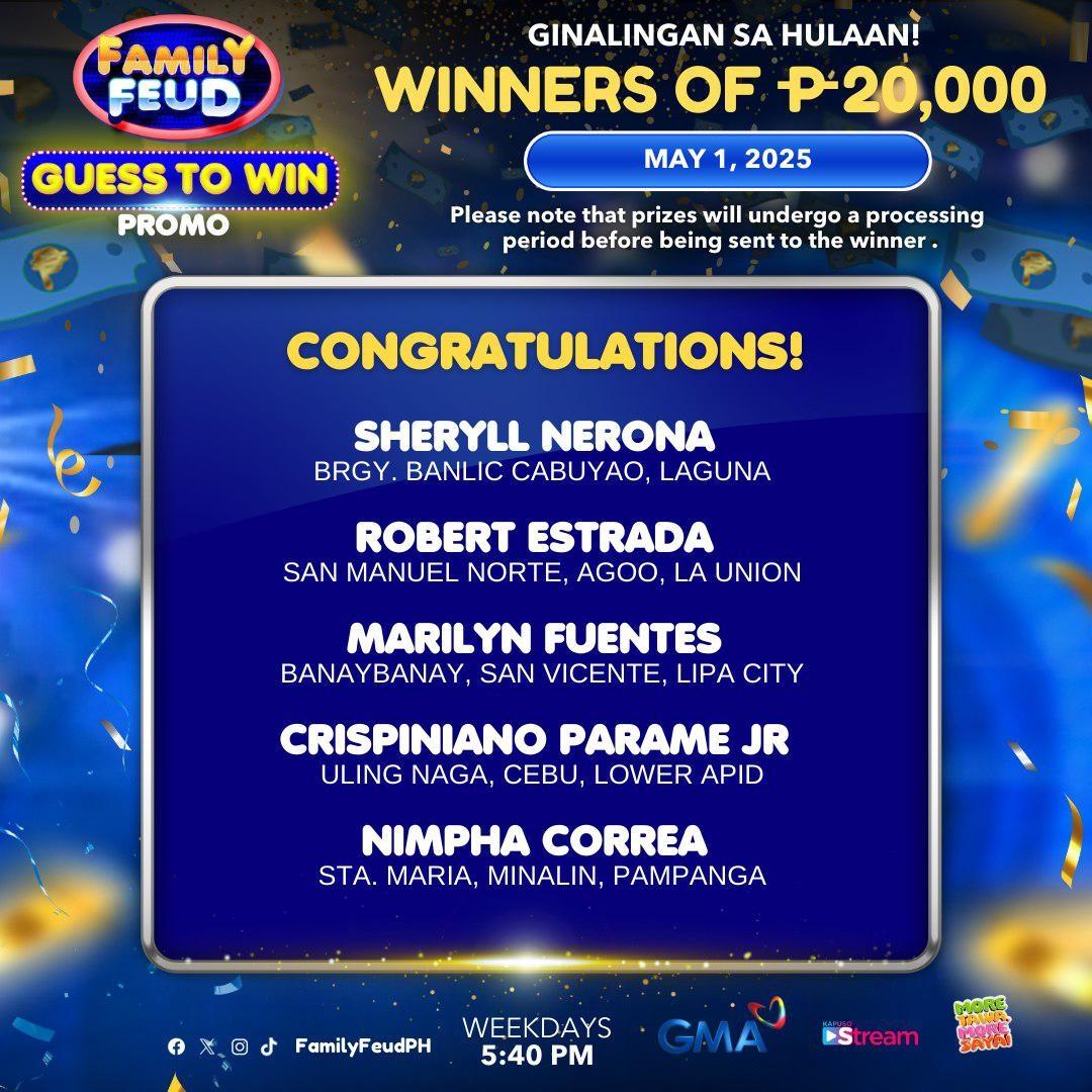 Narito ang mga listahan ng mga nagwagi sa Family Feud "Guess To Win" Promo.
