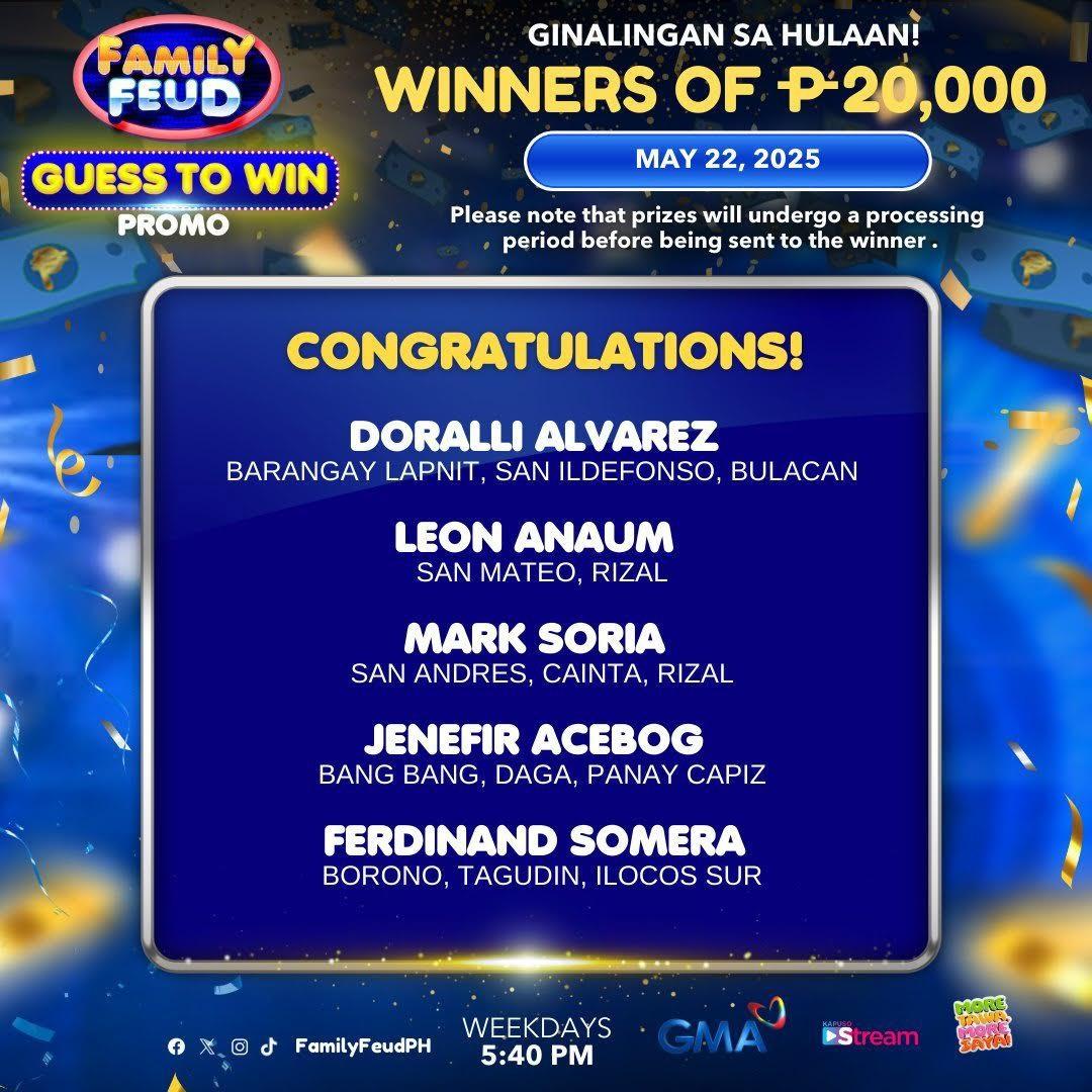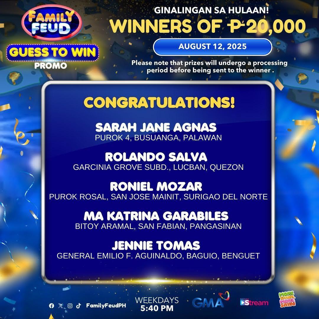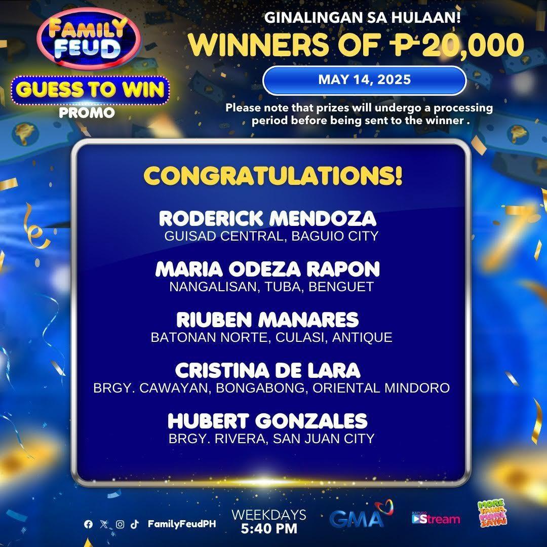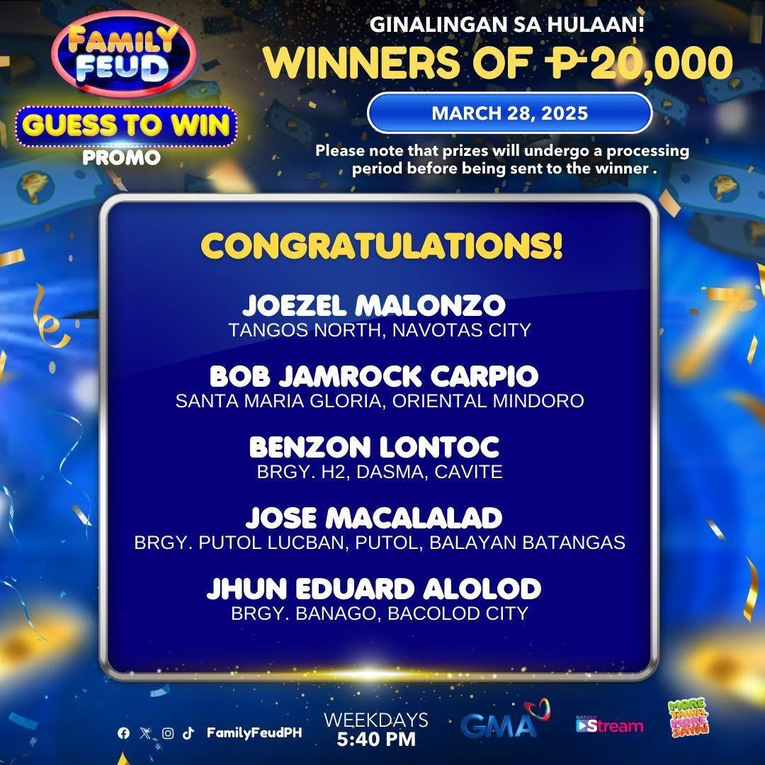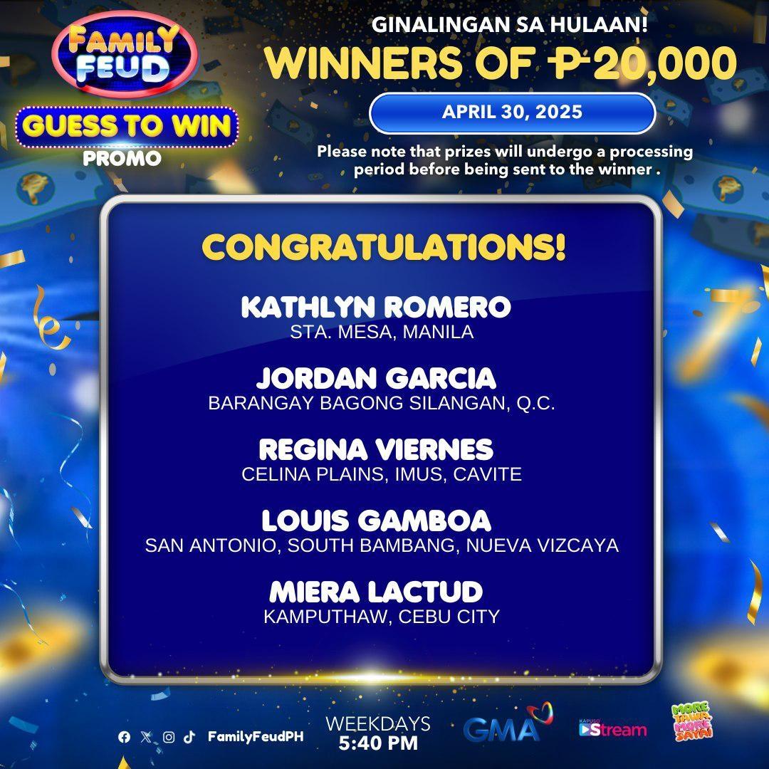 Narito ang mga listahan ng mga nagwagi sa Family Feud "Guess To Win" Promo.