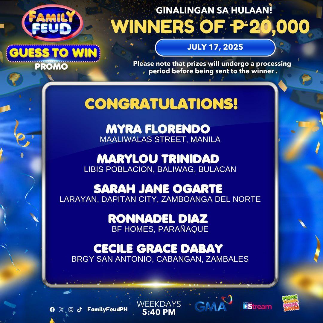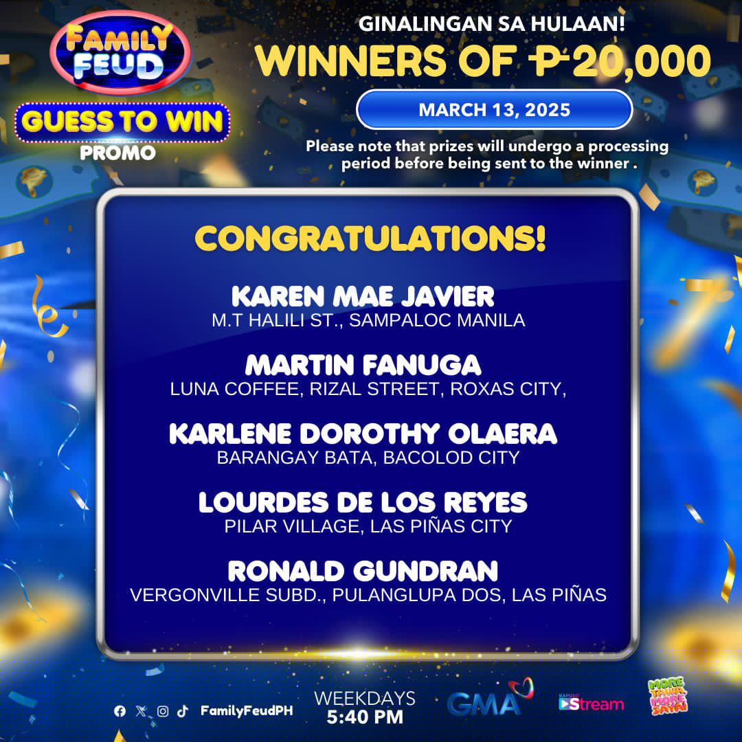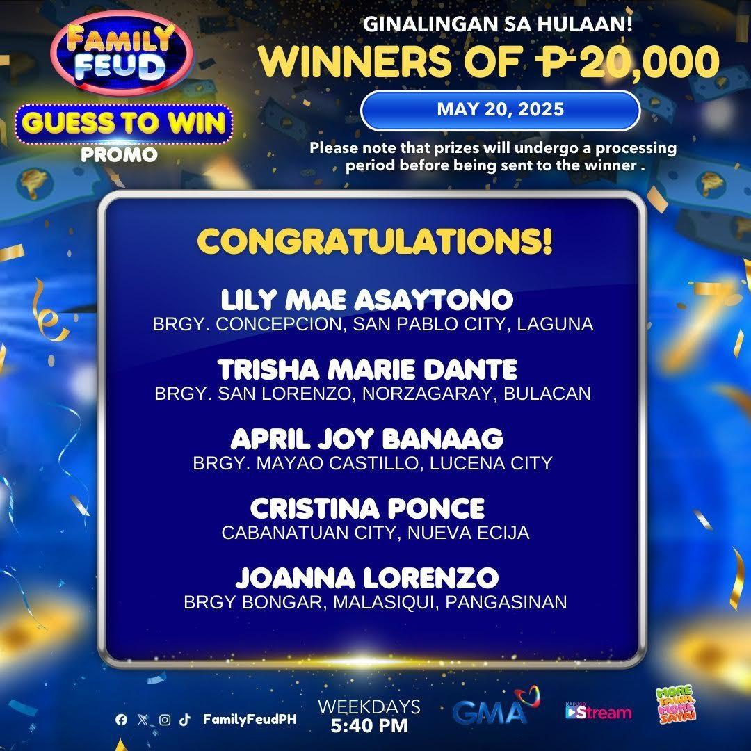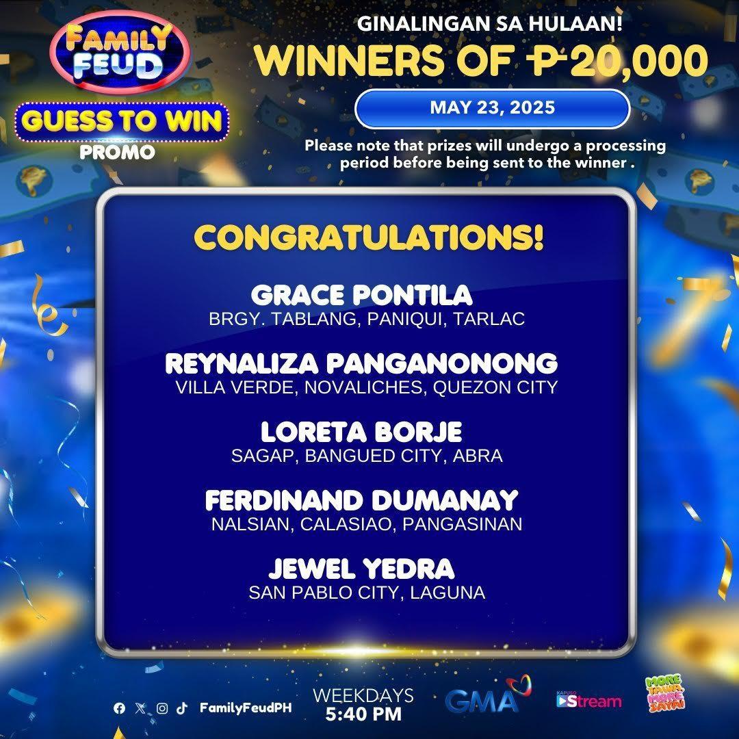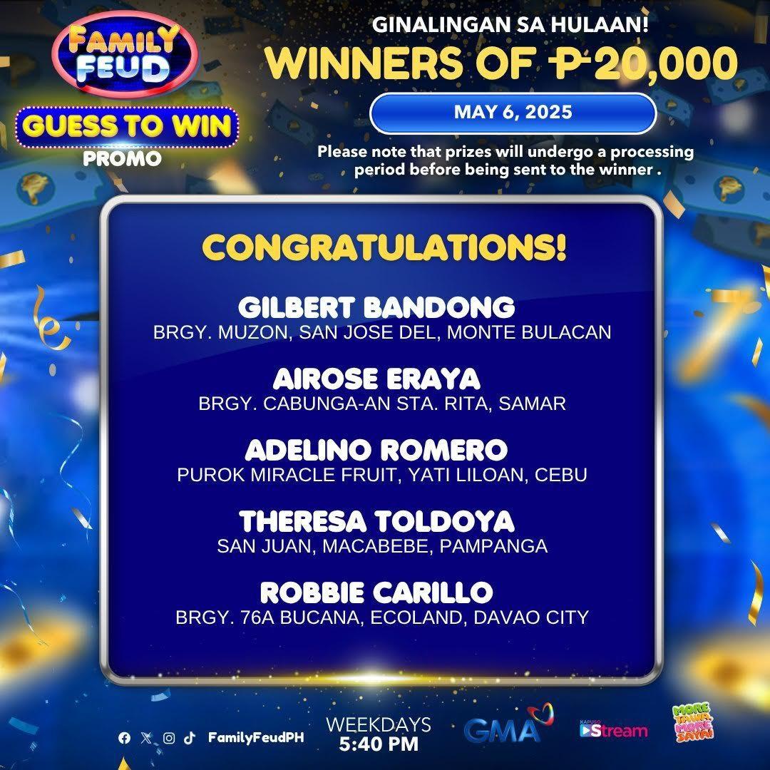 Narito ang mga listahan ng mga nagwagi sa Family Feud "Guess To Win" Promo.