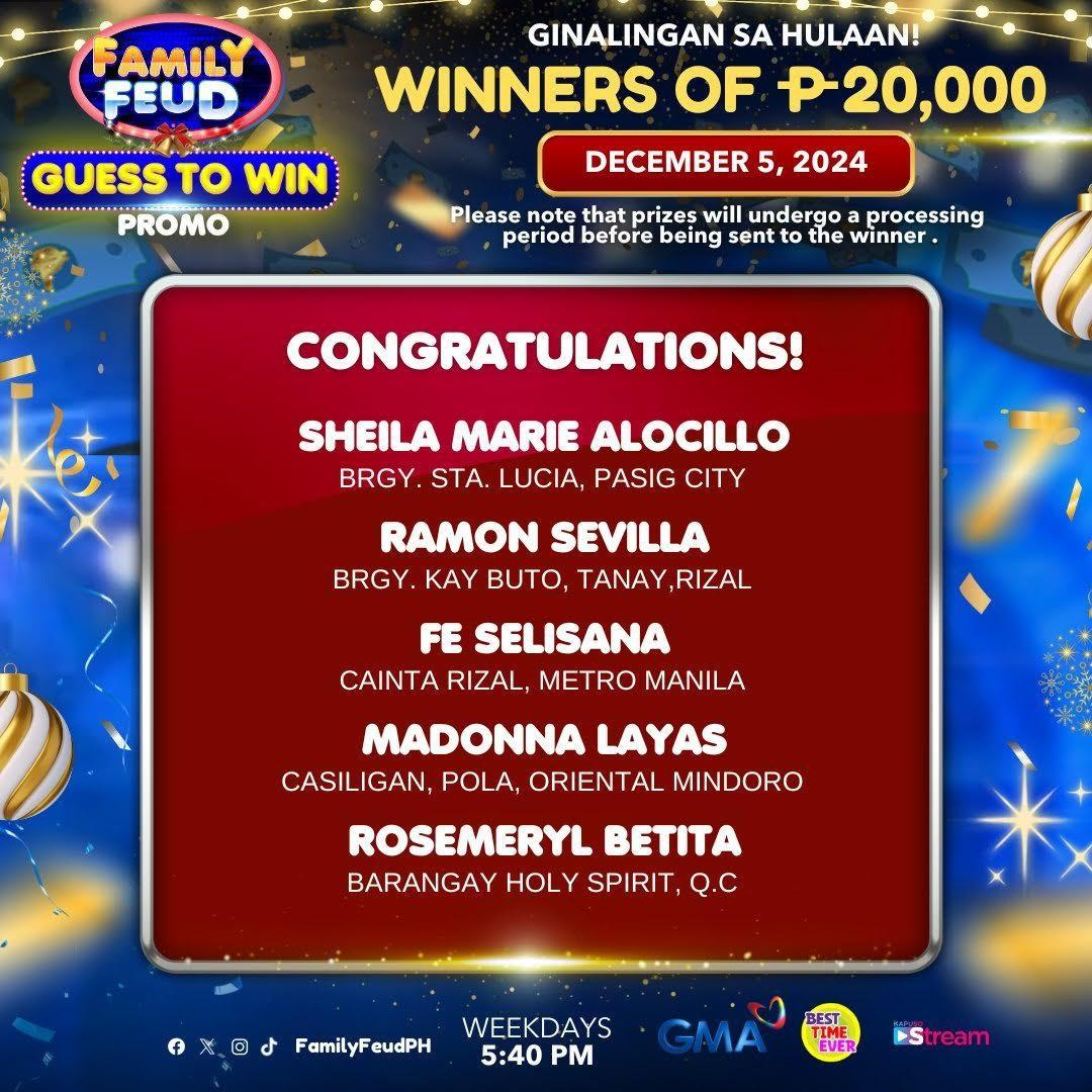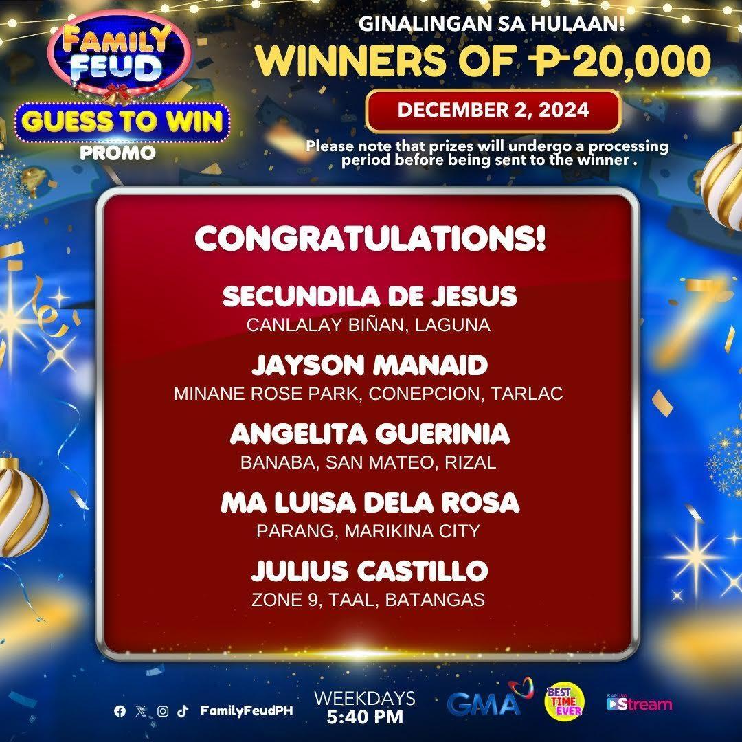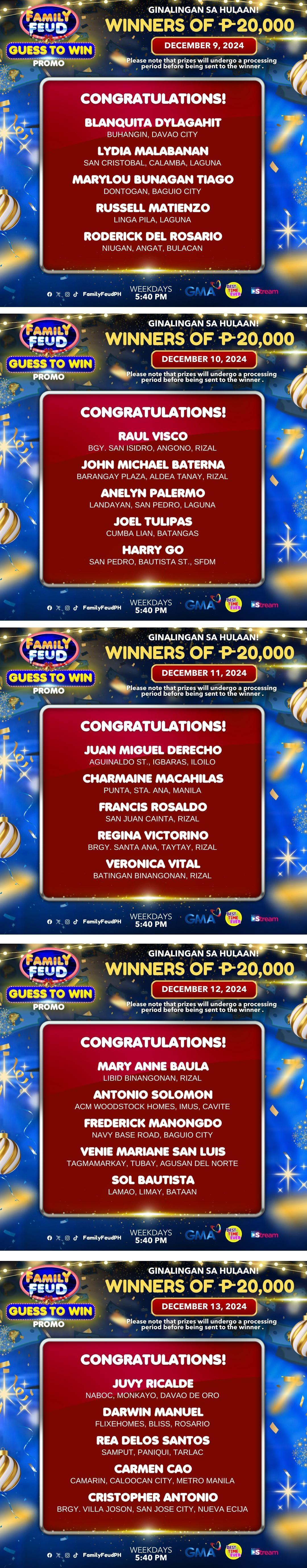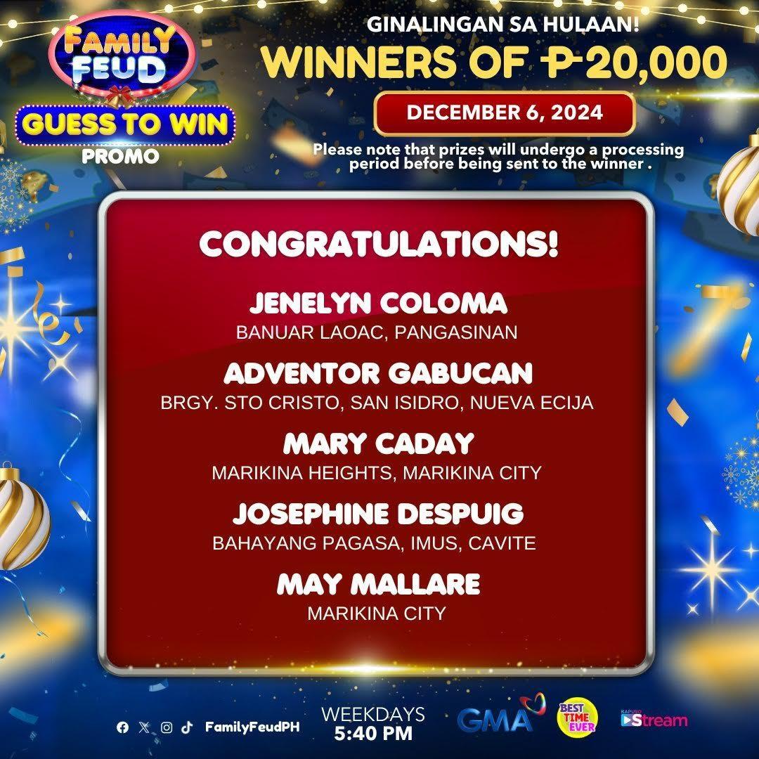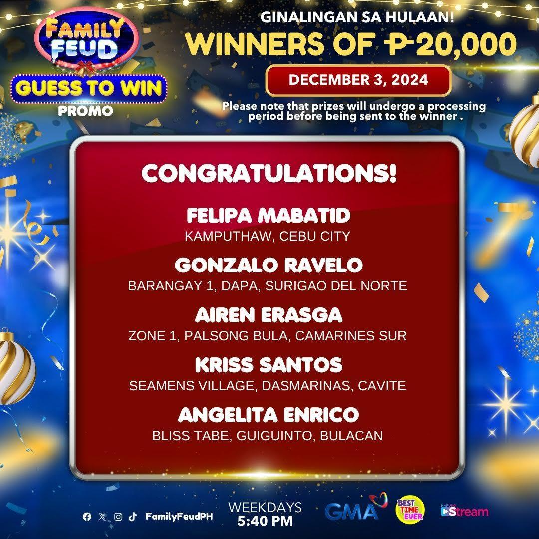 Narito ang mga listahan ng mga nagwagi sa Family Feud Guess To Win Promo.