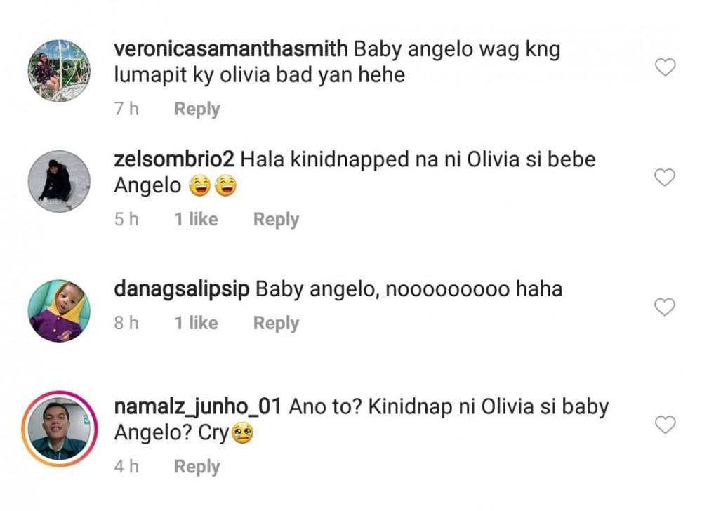 “Baby Angelo, wag kang lumapit kay Olivia, bad 'yan,” pabirong sabi ng isang netizen na nag-comment sa post ni Bruno.
