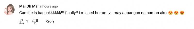 Komento ng isang tagahanga ni Camille, "Camille is baccckkkkkk!!! finally!! i missed her on tv.. may aabangan na naman ako."