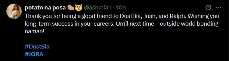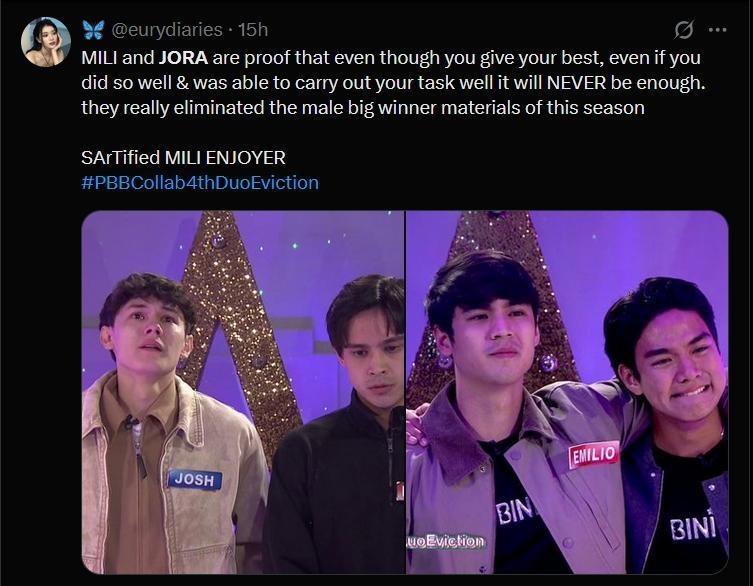 Online, hindi naman makapaniwala ang fans ng JoRa duo na sila ang latest evictees mula sa PBB. Sa X (dating Twitter) naglabas ng kanilang saloobin ang ilang netizens. Isang user pa nga ang nagsabi na pruweba umano ang duo JoRa at MiLi, and duo nina Michael Sager at Emilio Daez, na hindi sapat na gawin mo ang best mo para makaligtas mula sa eviction.
