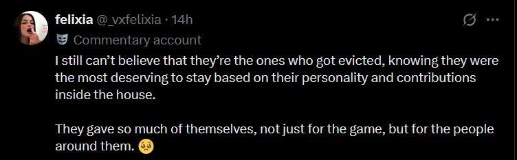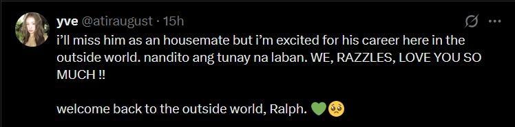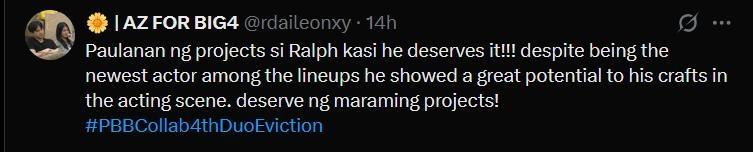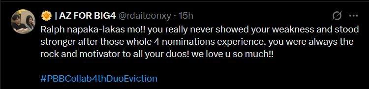 Ipinahayag naman ng isang netizen kung gaano siya hindi makapaniwala na sina Josh at Ralph ang latest evictee. Saad nito, “I still can't believe that they're the ones who got evicted, knowing they were the most deserving to stay based on their personality and contributions inside the house.