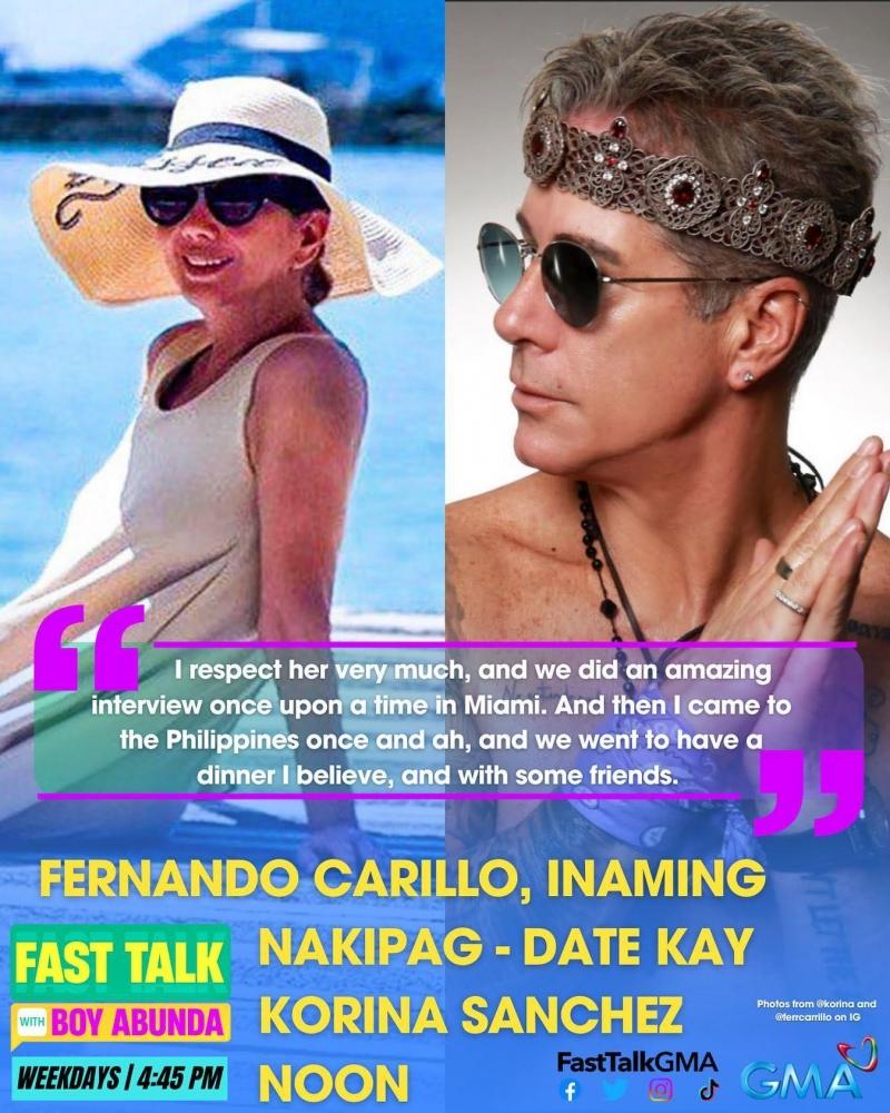 Sa pagbisita ni Fernando Carrillo sa Pilipinas ay napanood siya sa Fast Talk with Boy Abunda at dito kinumpirma niya ang naging dinner date nila ni Korina Sanchez noong taong 2000.