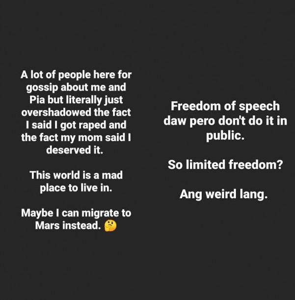 “A lot of people here are [sic] for gossip about me and Pia. But it literally just overshadowed the fact I said I got raped and the fact my mom said I deserved it,” she reiterated.