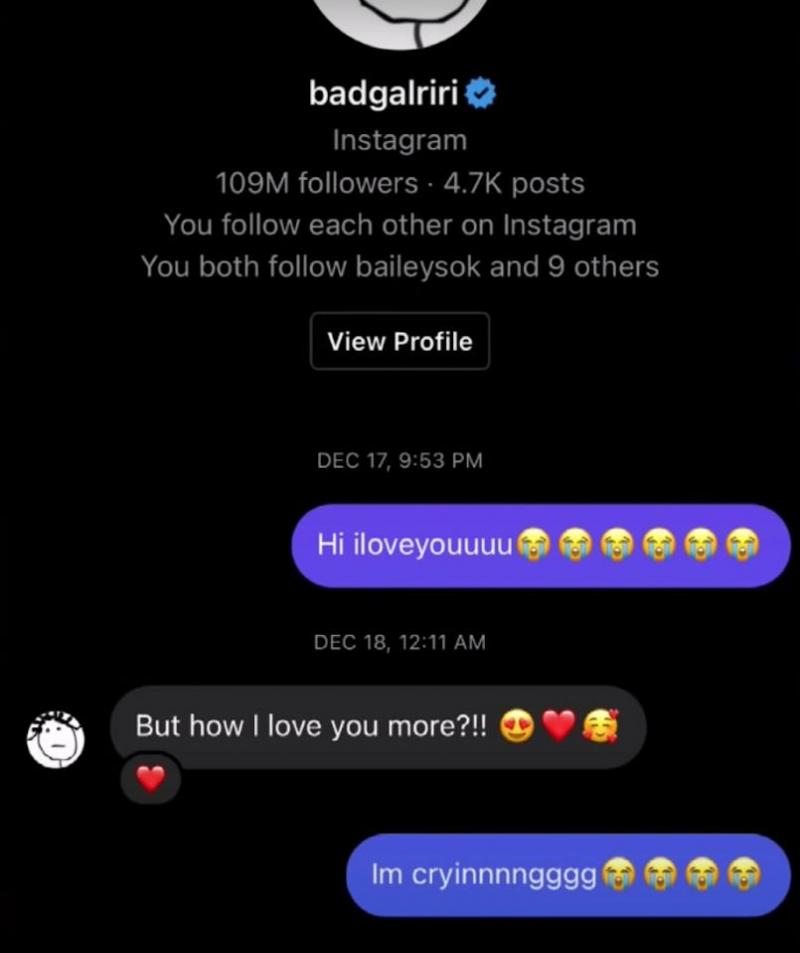 “Hi i love youuuuu” message ng TikToker na agad namang sinagot ni Rihanna “But how I love you more?!!!” reply ng singer.