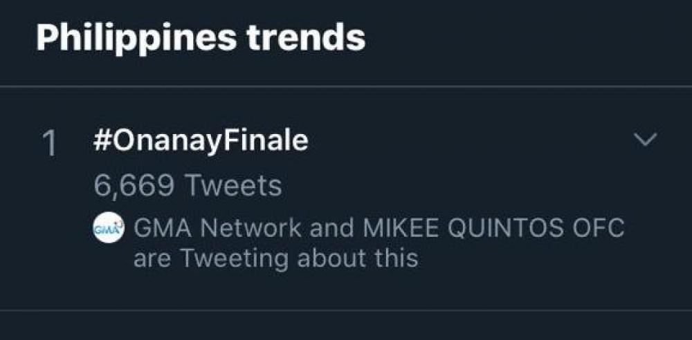Trending ang hashtag na #OnanayFinale kagabi, March 15, kung saan namatay ang karakter ni Cherie Gil dahil sa pagliligtas kay Natalie, na ginagampanan ni Kate Valdez.