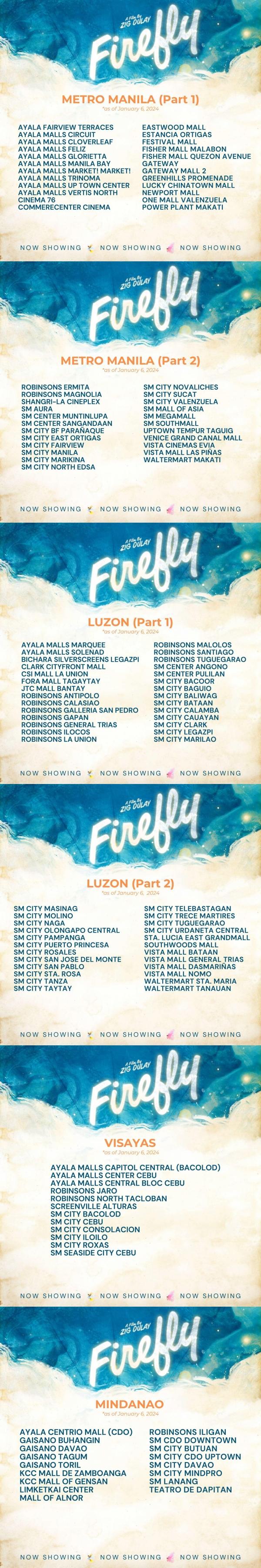 Narito ang kumpletong listahan ng mga sinehan kung saan mapapanood ang Firefly, na nanalo rin bilang Best Screenplay, ngayong araw, January 6: