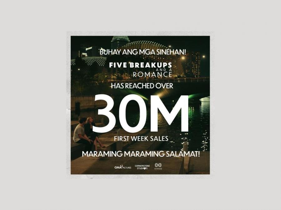 Sa loob ng isang linggo, mahigit 30 milyon na ang kinita ng pelikulang Five Breakups and a Romance na pinagbibidahan nina Asia's Multimedia Star Alden Richards at Julia Montes.