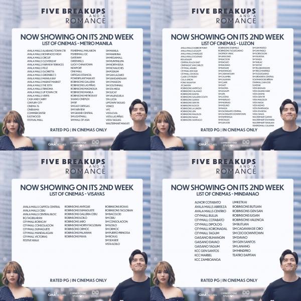 Sa higit 100 mga sinehan sa buong bansa mapapanood ang 'Five Breakups and a Romance' sa ikalawang linggo nito.