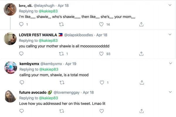 The series of tweets sat well with her fans who also couldn't believe that Kakie called her mom “Shawie.”