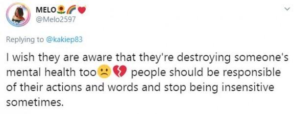 Kakie's followers agreed to her post. @Melo2597 said, "I wish they are aware that they're destroying someone's mental health too people should be responsible of their actions and words and stop being insensitive sometimes."