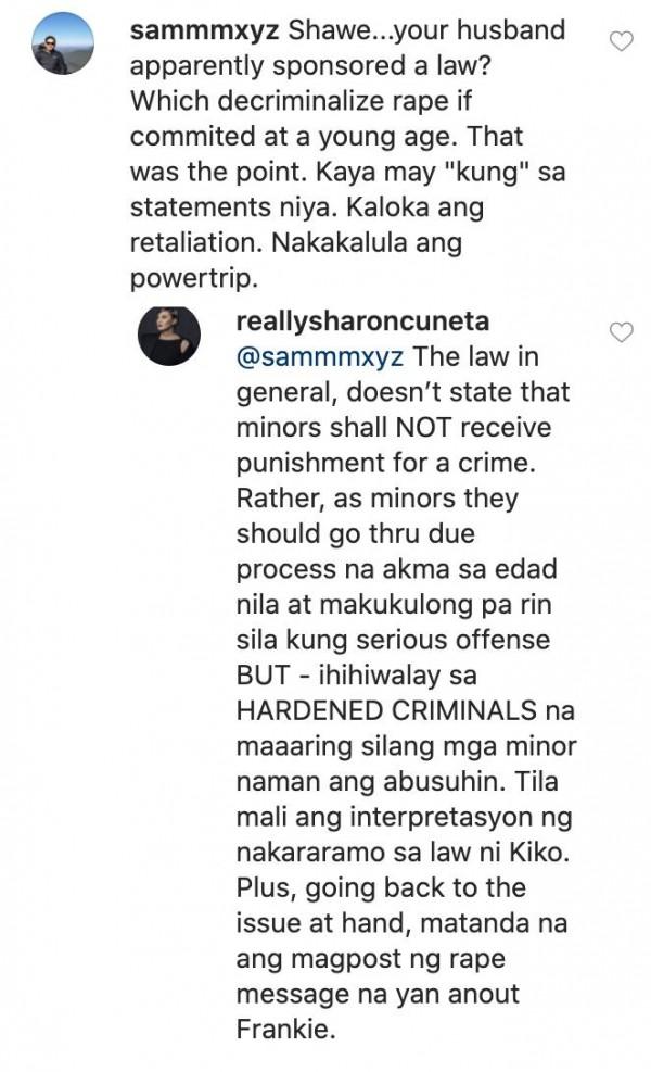 Sharon, defending her husband, said, “The law, in general, doesn't state that minors shall not receive punishment for a crime. Rather, as minors they should go through due process na akma sa edad nila at makukulong pa rin sila kung serious offense. BUT --- ihihiwalay sa hardnened criminals na maaring silang mga minor naman ang abusuhin.