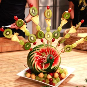 3. Skewer the kiwi, pineapple and grapes using the bamboo sticks. Place the skewered fruits into the carved watermelon's rear to form the peacock's tail.