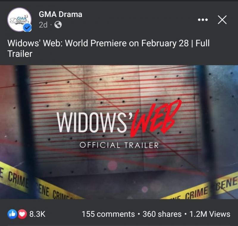 Mapapanood sa official Facebook page ng GMA Drama ang full trailer ng Widows' Web, kung saan ipinakita ang stellar cast at ang mga makapigil-hiningang eksena na tiyak na aabangan ng bawat Kapuso.