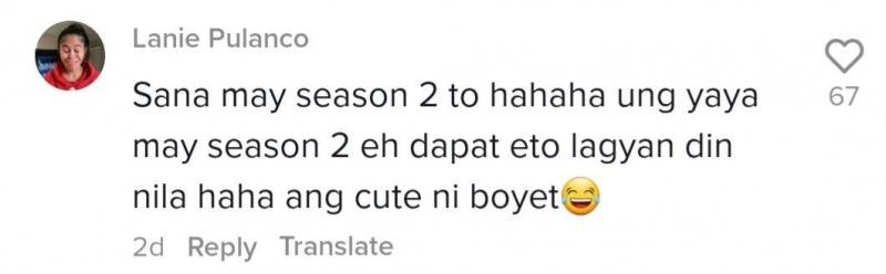 May ilan pa na humihiling ng season 2 ng series. Komento ng isang netizen," Sana may season 2 ito...haha ang cute ni boyet."