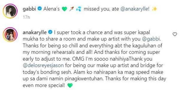 “Super took a chance and was super kapal mukha to share a room and makeup artist with you @gabbi. Thanks for being so chill and everything about the kaguluhan of my morning rehearsals and all! And thanks for coming super early to adjust to me. OMG I'm soooo nahihiya,” mensahe ng TV host-singer sa aktres.