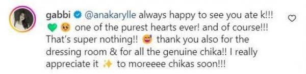 Agad naman na nag-reply si Gabbi sa kanyang Ate Karylle. Aniya, “Always happy to see you ate K!!! One of the purest hearts ever! and of course!!! That's super nothing!! thank you also for the dressing room & for all the genuine chika!! I really appreciate it. To moreeee chikas soon!!!”