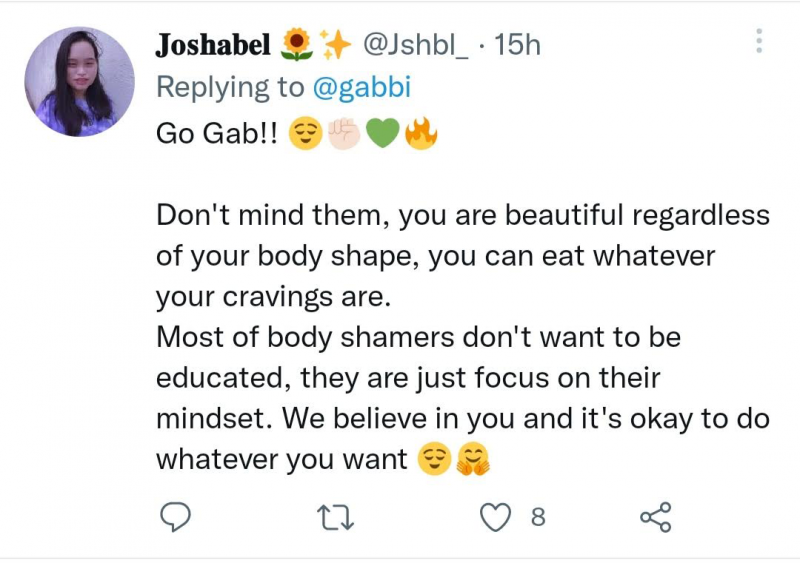 One user replied, “Go Gab! Don't mind them, you are beautiful regardless of your body shape, you can eat whatever your cravings are. Most body shamers don't want to be educated, they are just focused on their mindset. We believe in you and it's okay to do whatever you want.”