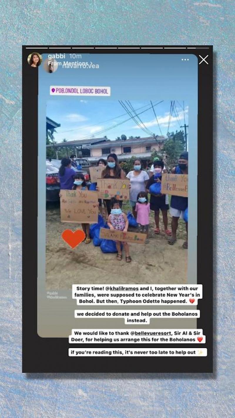 “Khalil Ramos and I, together with our families, were supposed to celebrate the New Year in Bohol. But then, Typhoon Odette happened. We decided to donate and help out the Boholaños instead,” she wrote in an Instagram story on Monday, January 10.