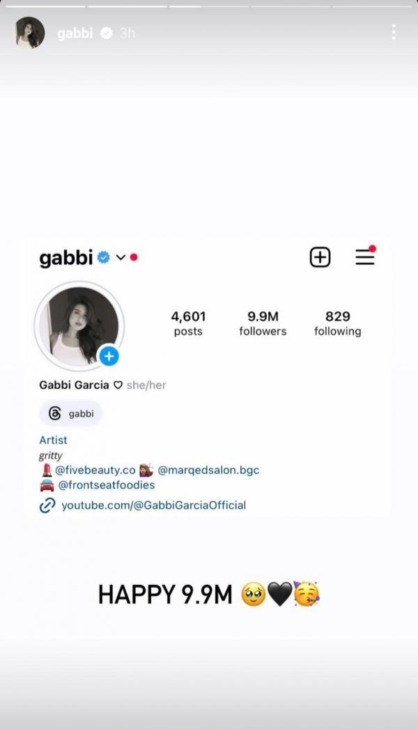 Gabbi recently celebrated another milestone as she reached 9.9 million followers on the said social media platform. The former Unbreak My Heart star proudly shared her new achievement through posting a screenshot of her profile on Instagram stories.