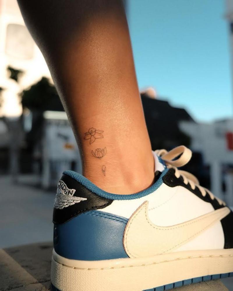 Her minimalist tattoo is of a Narcissus flower--its blooming stages illustrated vertically in three ways, with one that is fully opened on the topmost.