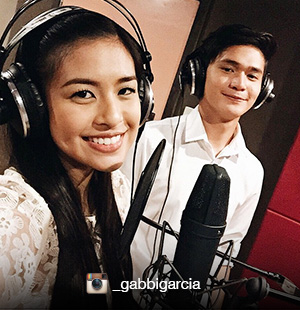 On Tuesday, April 21, Gabbi Garcia posted a photo in Instagram of her with love team partner Ruru Madrid in a recording studio. It was captioned "Recording with @rurumadrid8 #Soon ??"