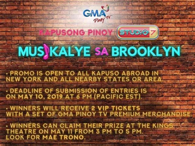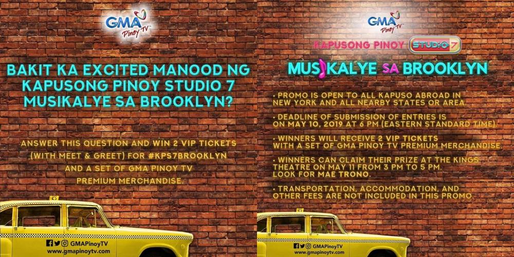 Tell us why you're excited to watch 'Kapusong Pinoy Studio 7 Musikalye sa Brooklyn' and get a chance to win 2 VIP tickets to the live concert this May 11, 2019 happening at King's Theatre in Brooklyn, New York.