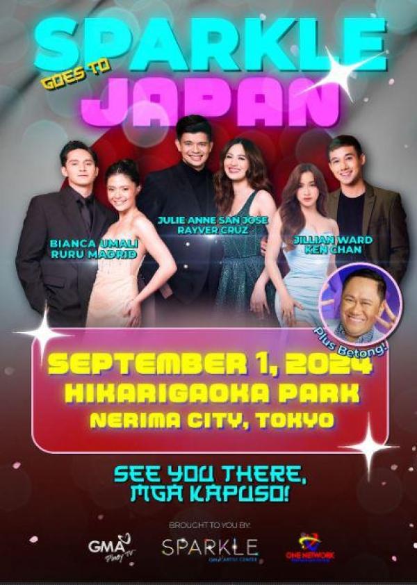For the Sparkle World Tour's final show, the artist center is flying to Tokyo, Japan on September 1, 2024. You can't miss the showstopping performances of Philippine TV's New Action Hero Ruru Madrid, Sparkle's Prime Gem Bianca Umali, Star of the New Gen Jillian Ward, Kapuso leading man Ken Chan, Kapuso Total Heartthrob Rayver Cruz, and Asia's Limitless Star Julie Anne San Jose at Nerima City.