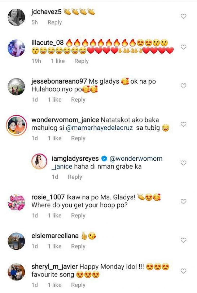 Sa Instagram, makikitang habang naghu-hula hoop kasama ang kaibigang si Mamarhaye Dela Cruz sa harap ng ilog, kinakanta rin ni Gladys ang hit song ng The Bangles na "Manic Monday."