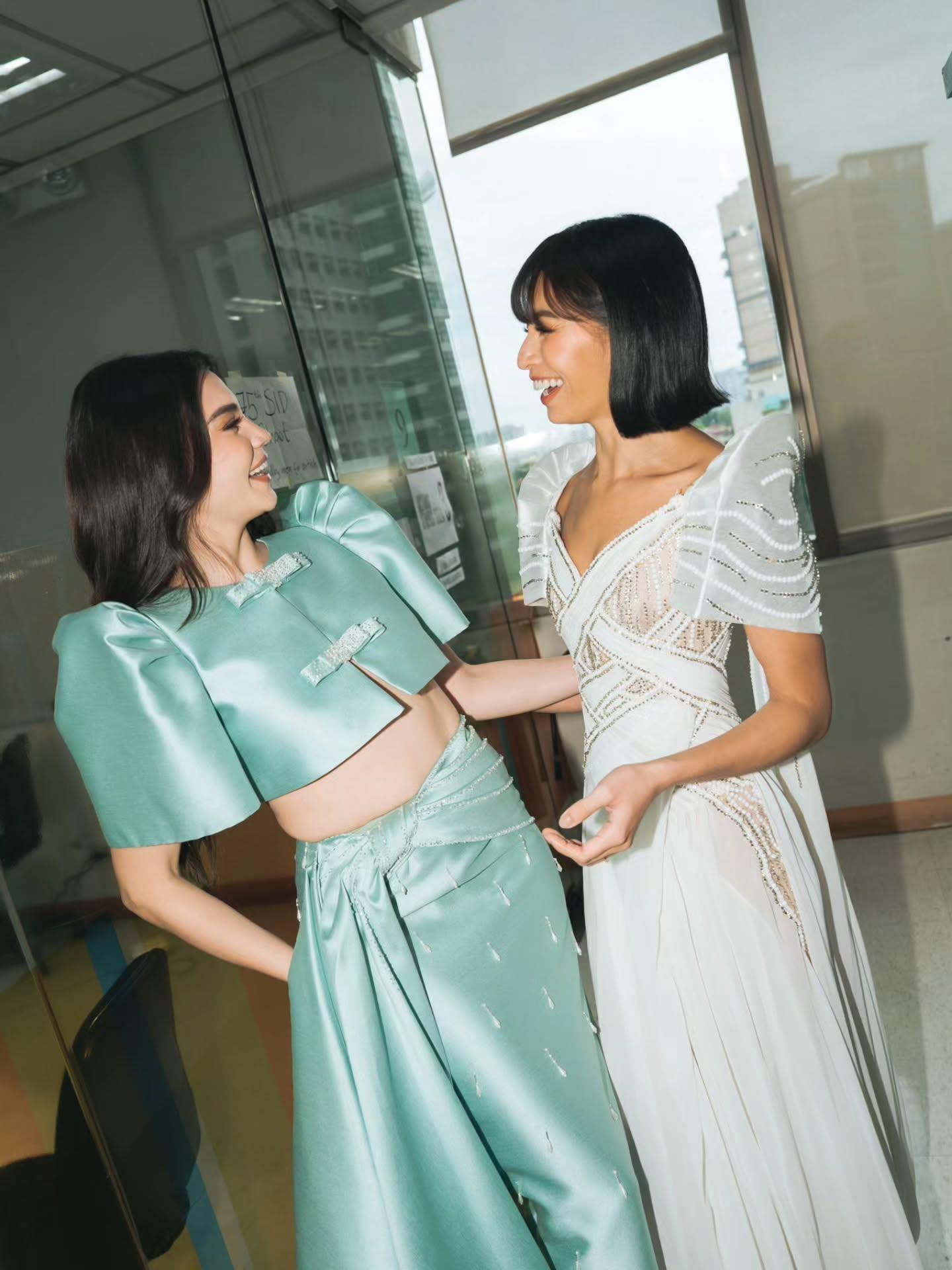 Nakasuot si Glaiza ng loose-fitting polo shirt at jeans, habang sweet girl naman ang atake ni Rhian sa kaniyang short beige dress.