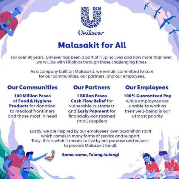 In the Philippines, Unilever has pledged 100 million pesos worth of food and hygiene products for medical frontliners and those in most need; 1 billion pesos cash flow relief for vulnerable customers and suppliers; and 100% guaranteed salary for their employees.