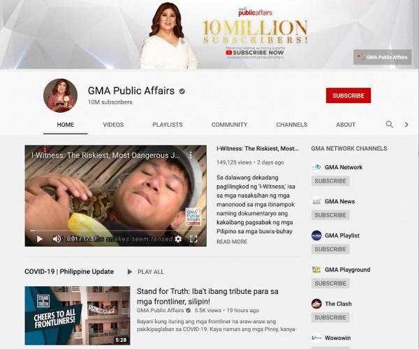GMA's second channel, GMA Public Affairs, reached its 10 million subscriber mark yesterday, April 7, making it the first Philippine network to have two 10million YouTube subscribers in the video-sharing platform.