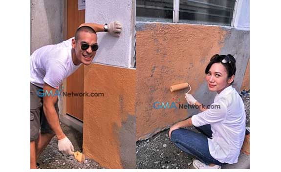 GMA Artist Center talents Pancho Magno and Kristine Velasco recently spent time painting the houses built for the displaced families of Typhoon Pedring in Barangay Tanza, Navotas City.